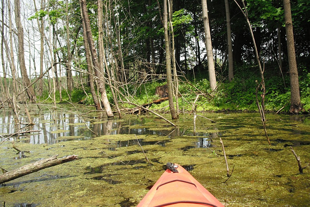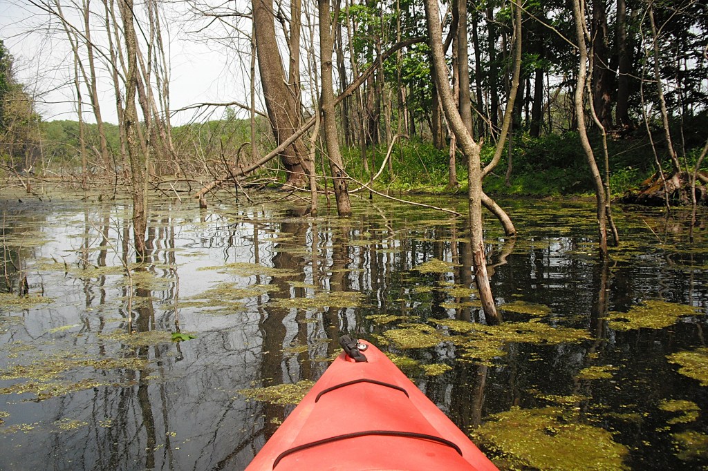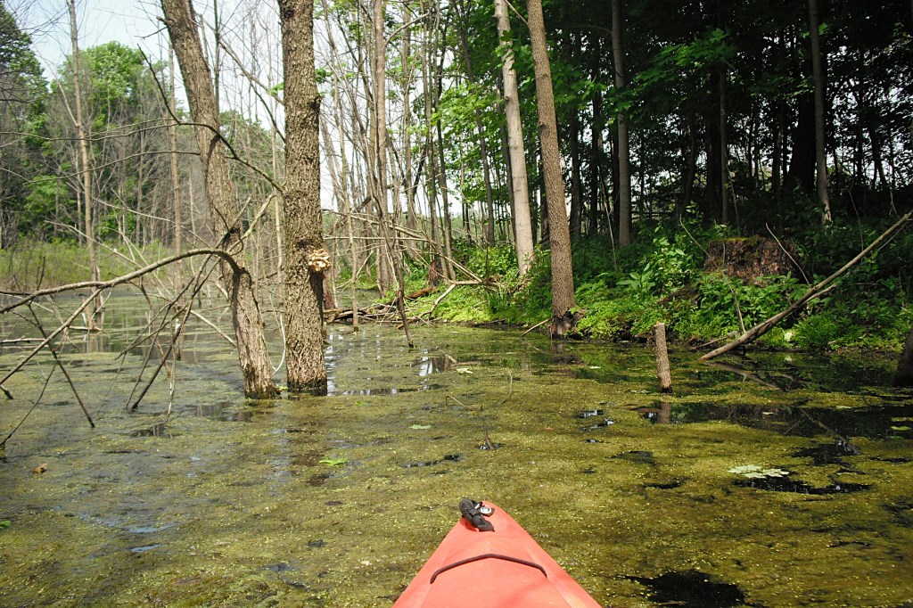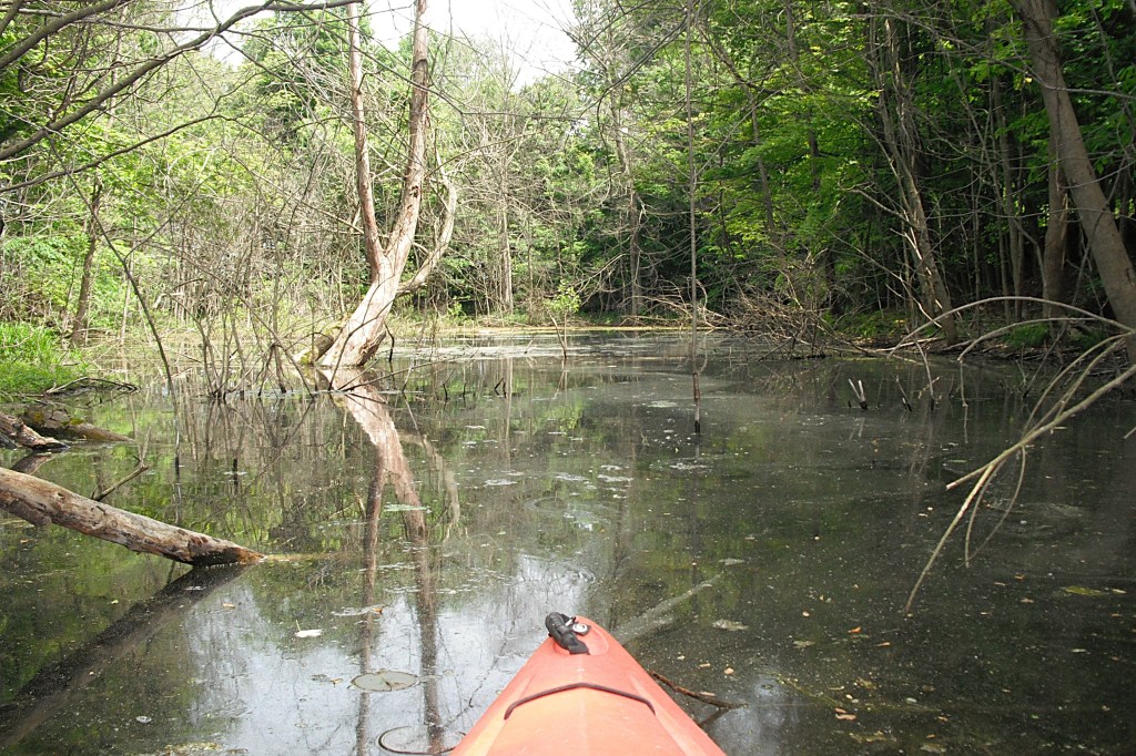 On one of the ponds, I blazed a water trail through the woods and ended up on the south basin. The following photos trace my route through the flooded brush and trees. During low water levels, the water trail may be impossible to paddle.