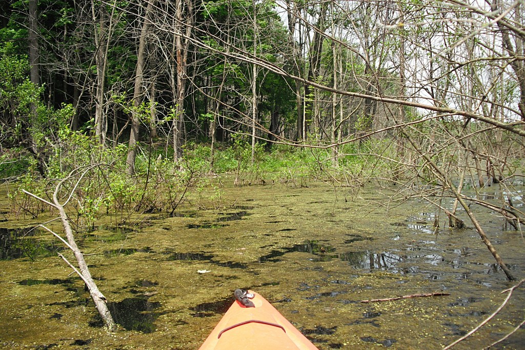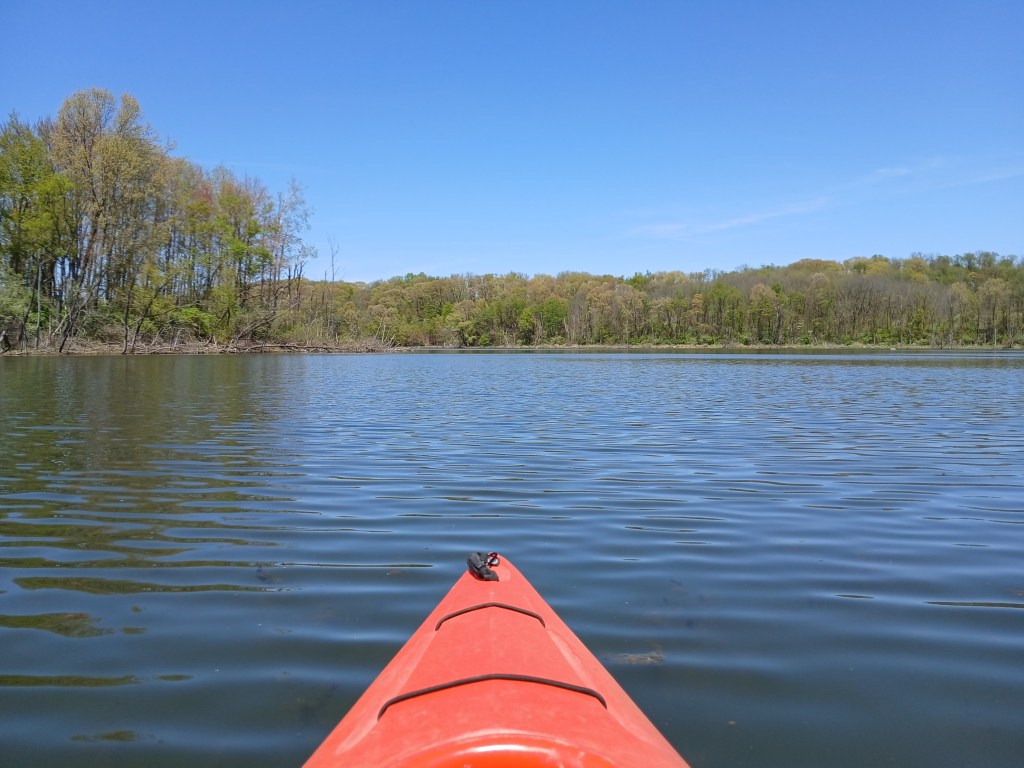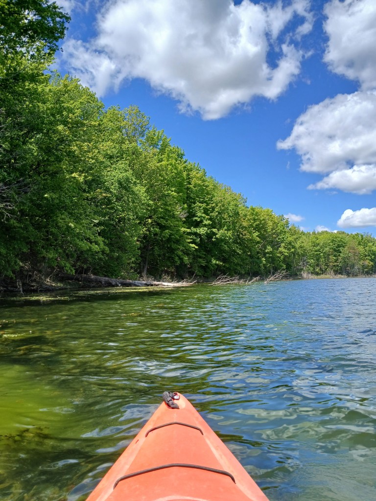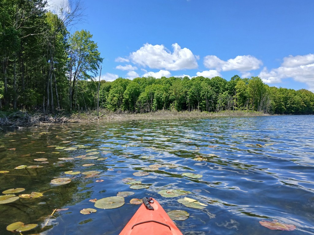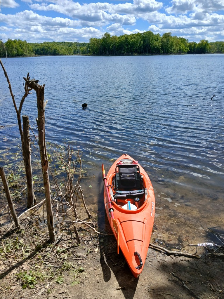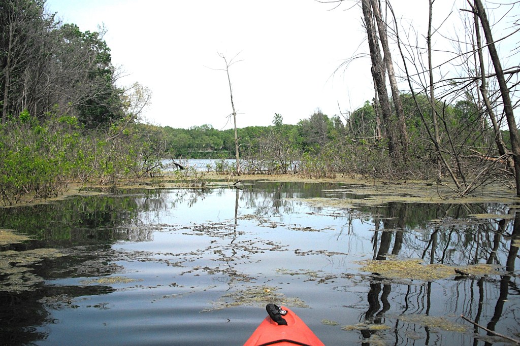In the northwest corner of the north basin, a small area on shore has been cleared of brush. It’s a good spot to get out of your kayak, stretch, and take a break. The narrows is straight across the lake.
