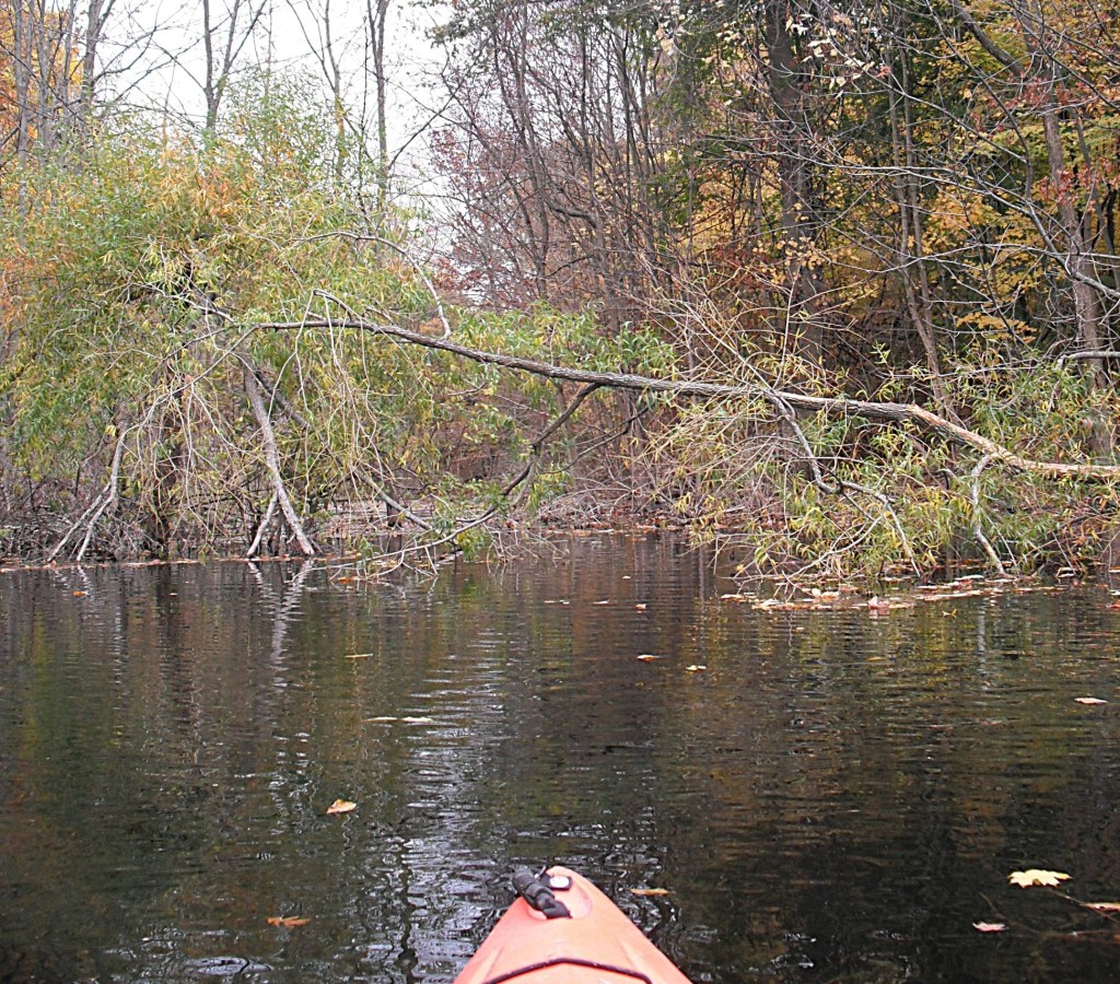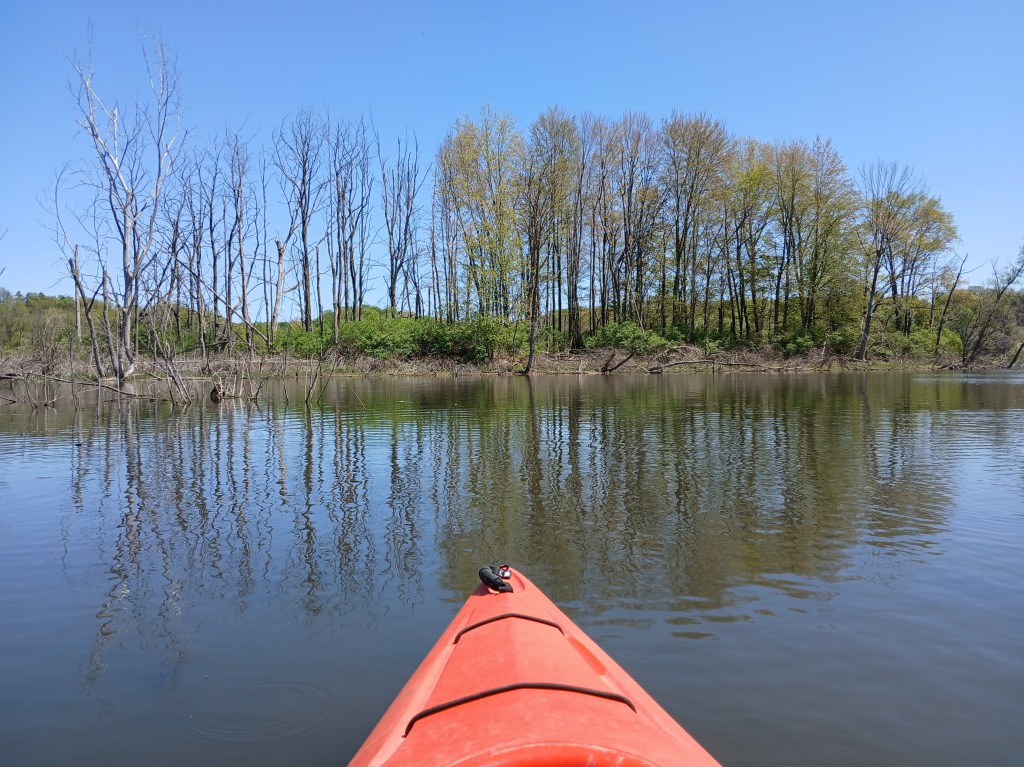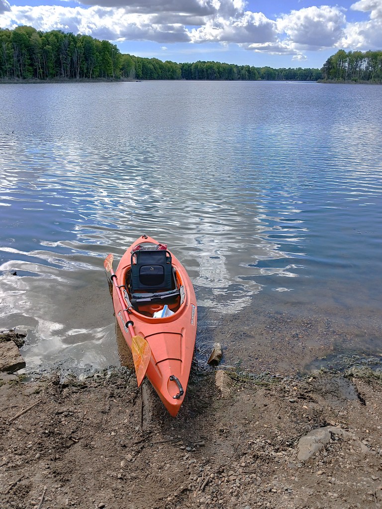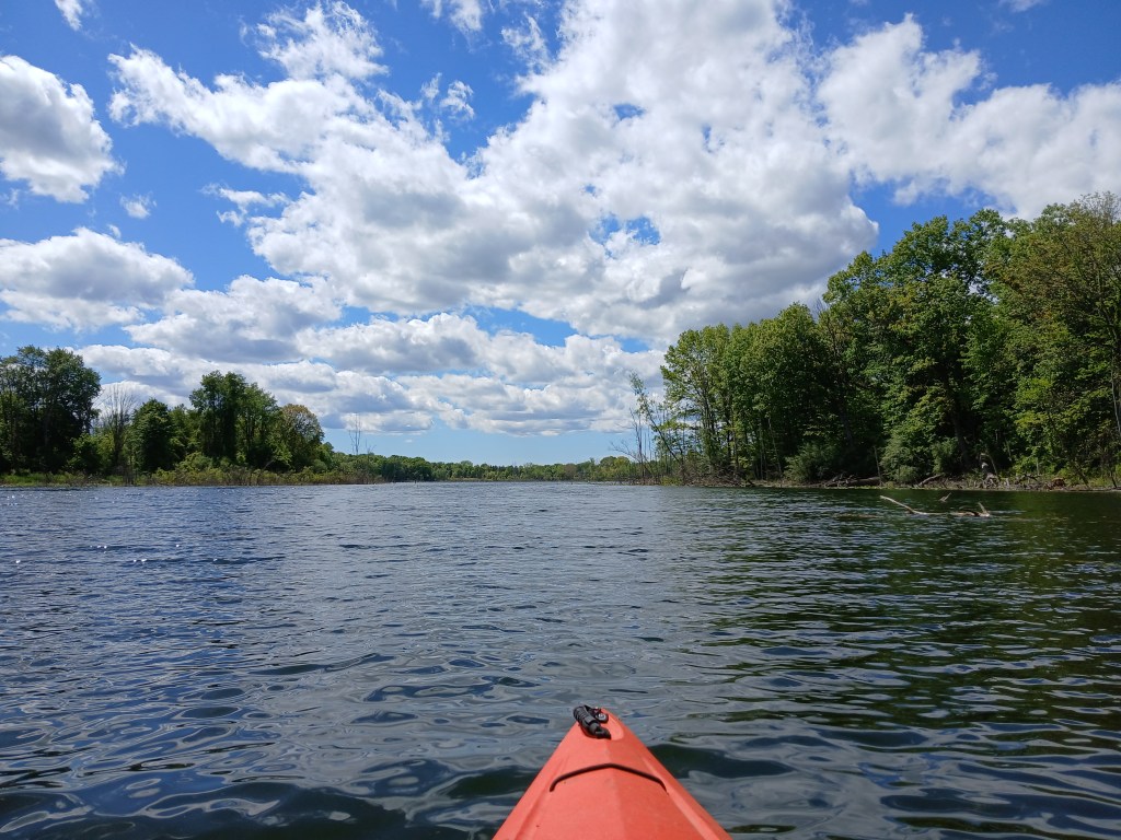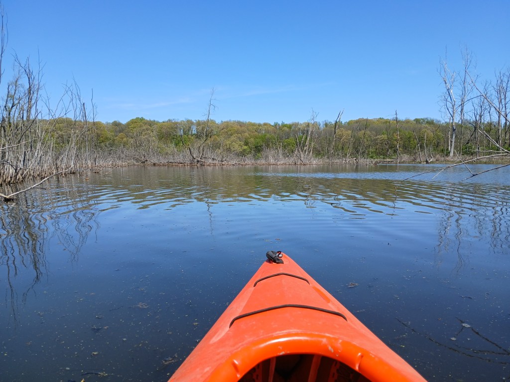 In the northwest corner of the north basin, a small area on shore has been cleared of brush. It’s a good spot to get out of your kayak, stretch, and take a break. The narrows is straight across the lake.