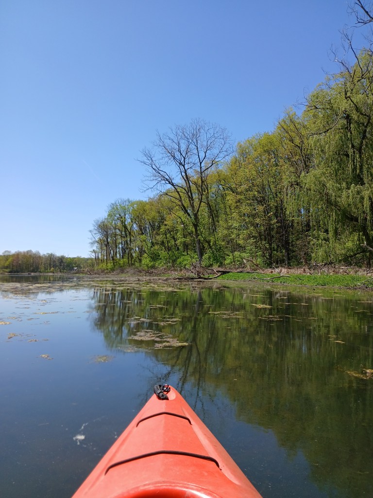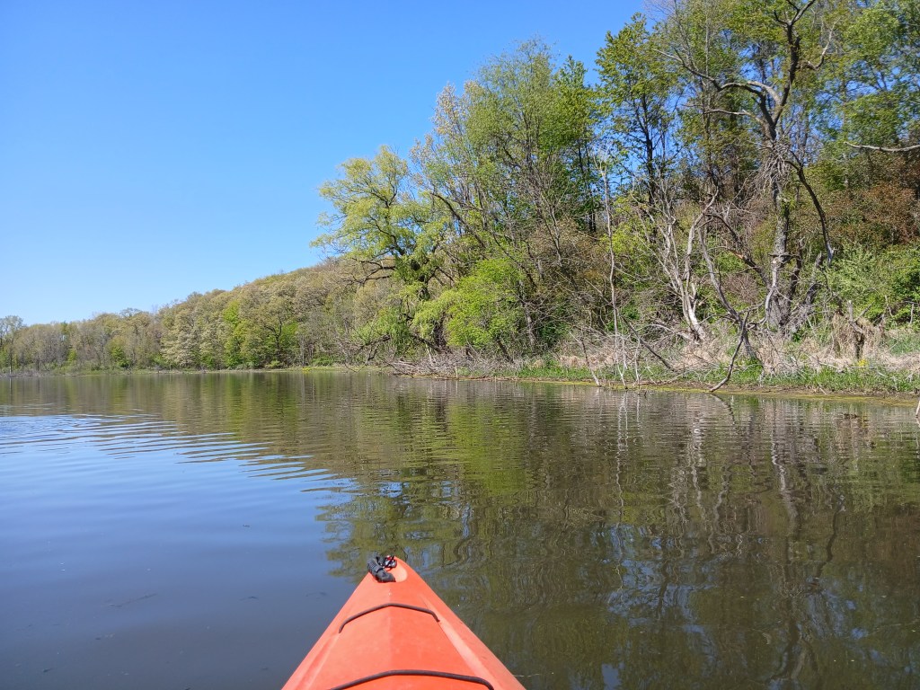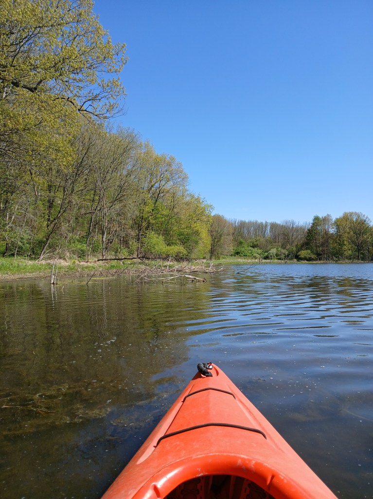 Twin Lakes East is not very popular for boating or fishing because of excessive aquatic vegetation growth. During summer, much of the lake is covered by algae and other vegetation. I kayaked the lake in early May and the algae was limited to shoreline areas. I recommend kayaking the lake in early spring, before the vegetation blooms. Another option is late fall, after the seasonal vegetation die-off. On my May trip, I observed hundreds of carp in the shoreline shallows. Many of them were in a foot of water or less with their backs out of the water. Fun to watch!