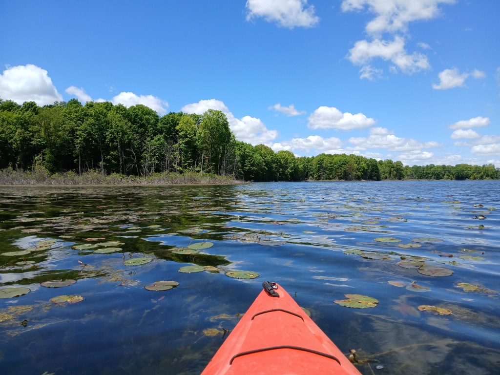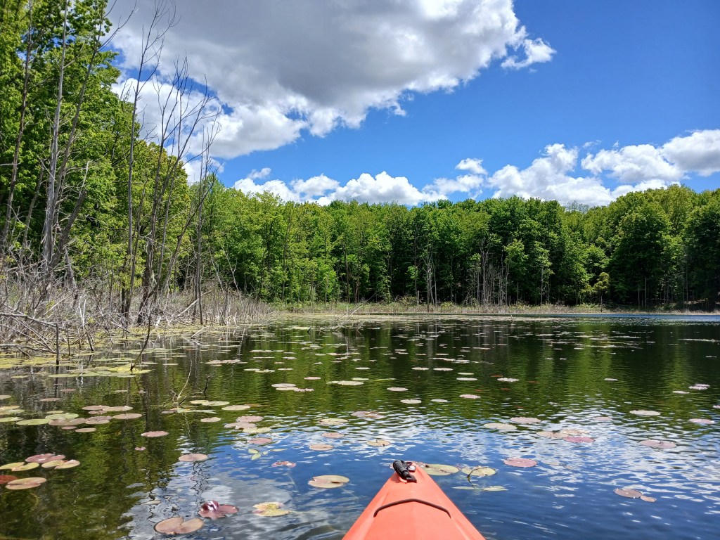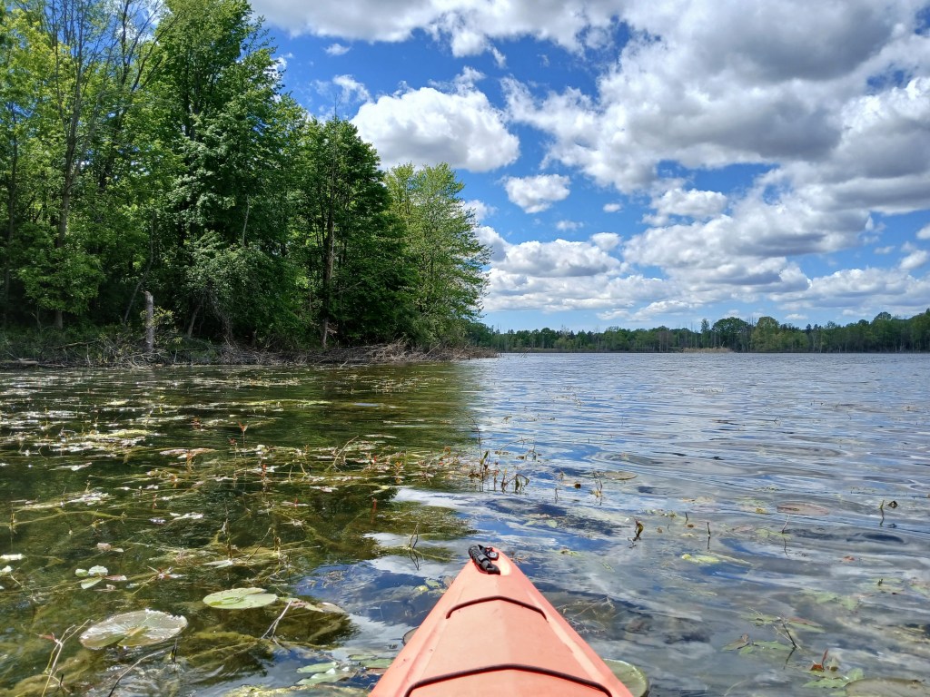 In the summer, some parts of the lake are overgrown with aquatic vegetation. Most of the lake remains open and is easily paddled. There are a lot of dead trees and dead brush along the shoreline.