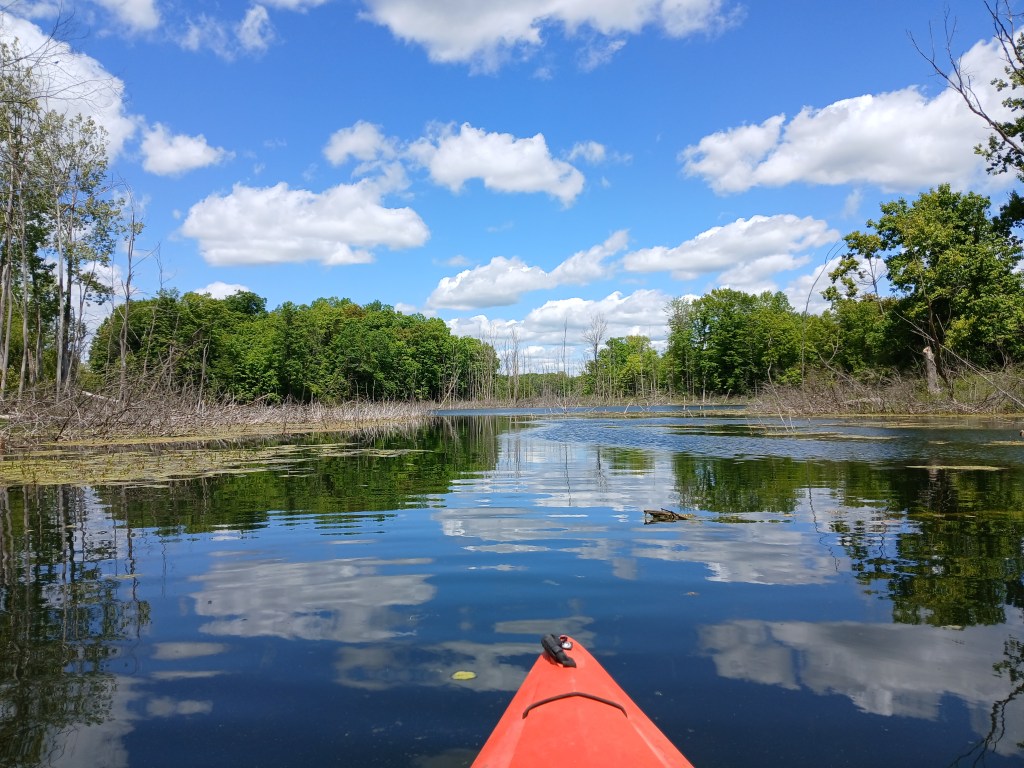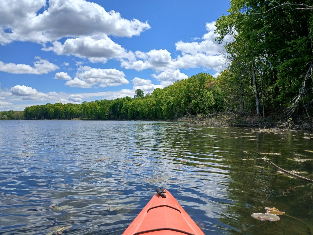 About a third of the shoreline is developed with homes, all on the south end of the lake. Most of the photos feature the undeveloped portions of the lake. A large farm is situated on the north corner of the lake. If the wind is from the north, kayakers can expect an unpleasant odor coming from the farm.