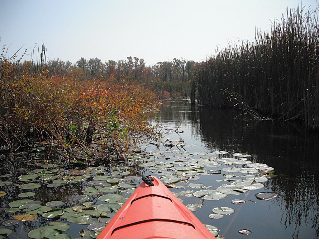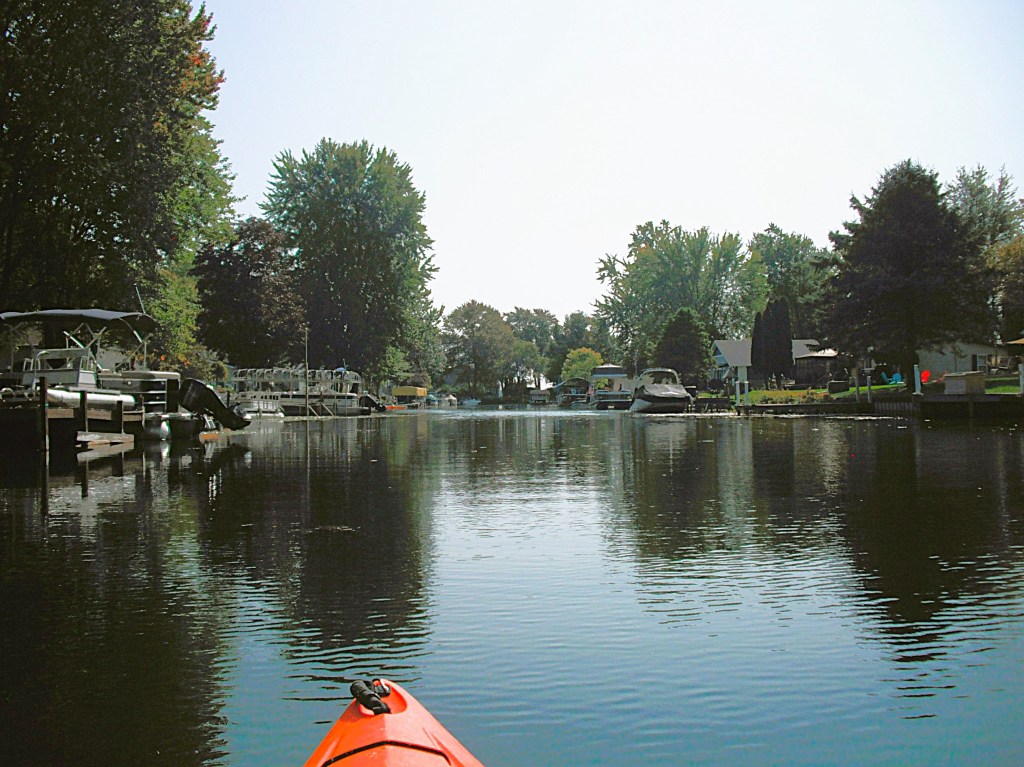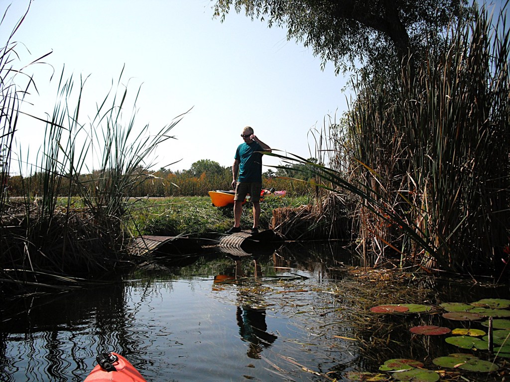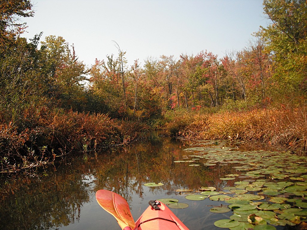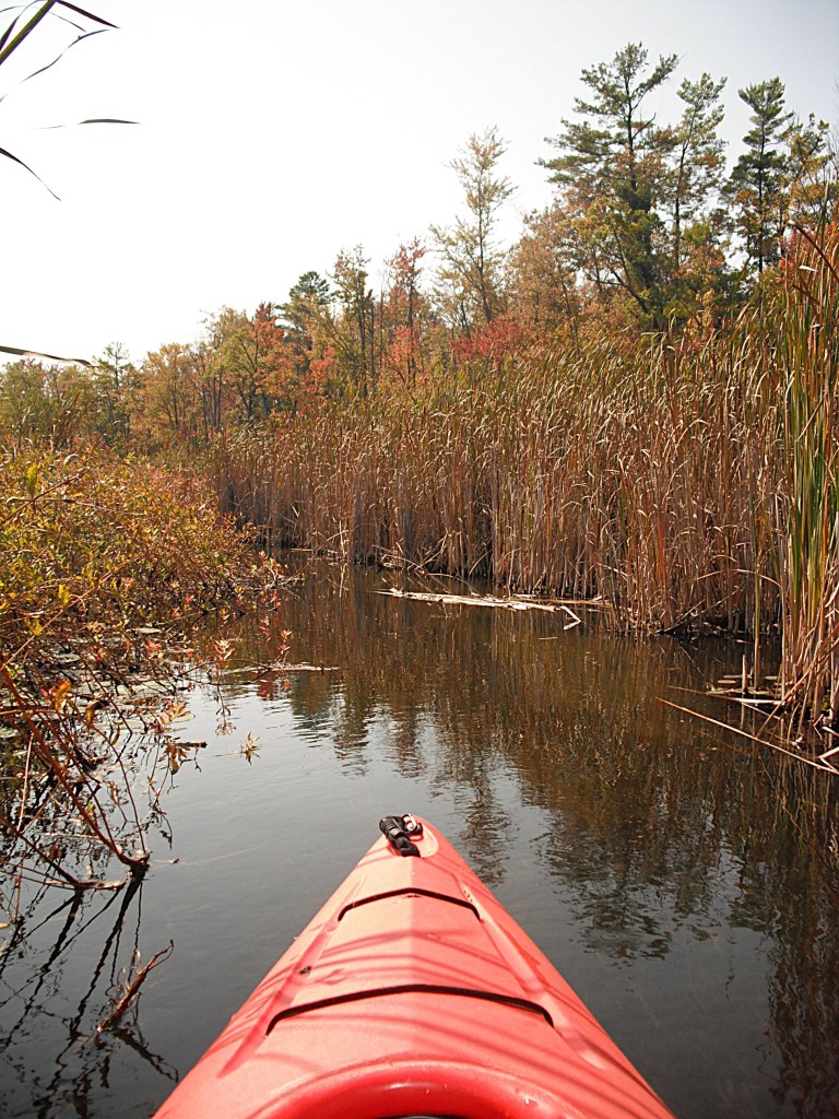 We paddled the recreation area shoreline south to the outlet, Payne Creek. The outlet is hidden in a small area of cattail marsh. The short waterway through the cattails will take you to the portage over highway M179. The water is deep next to the culverts, so be cautious.