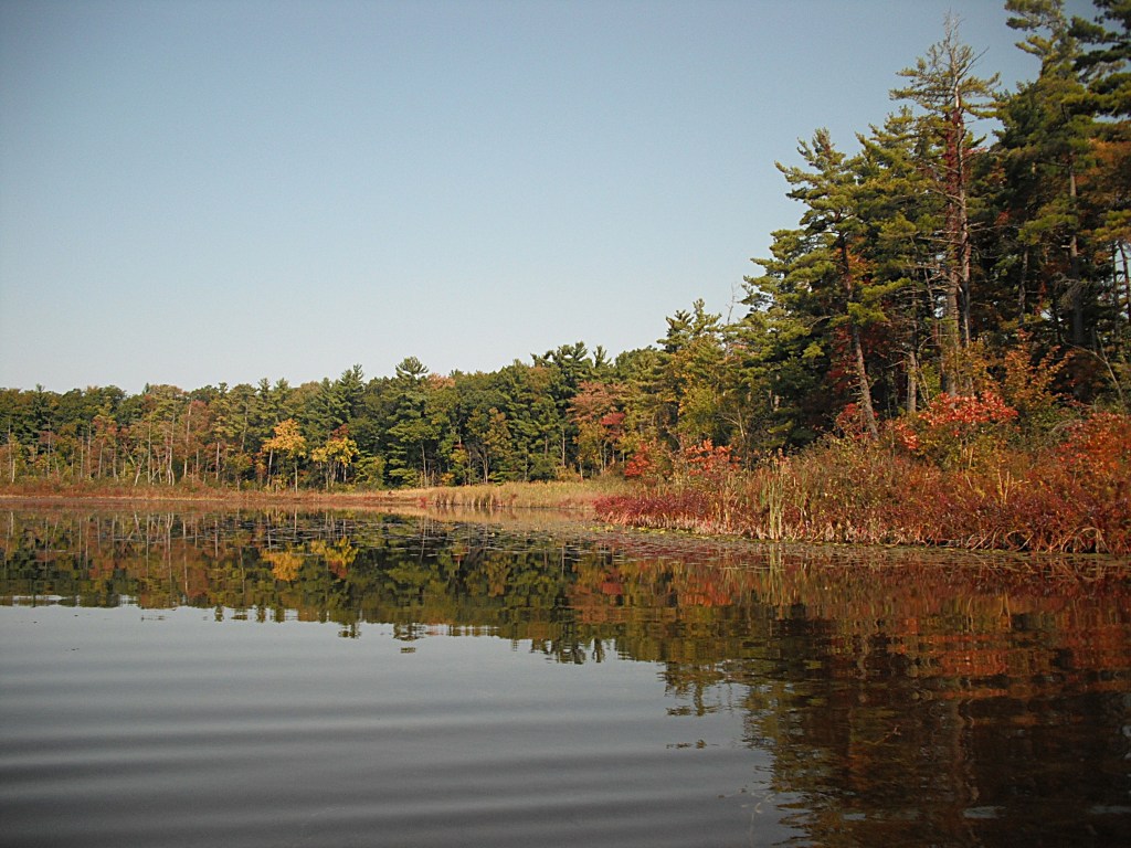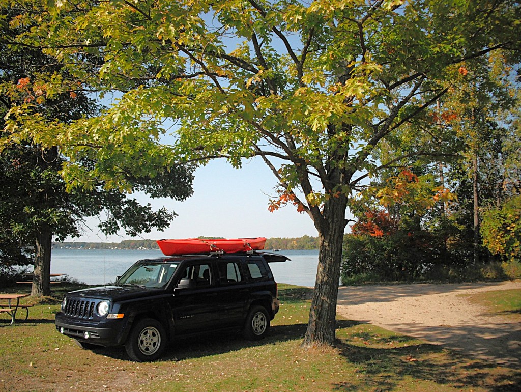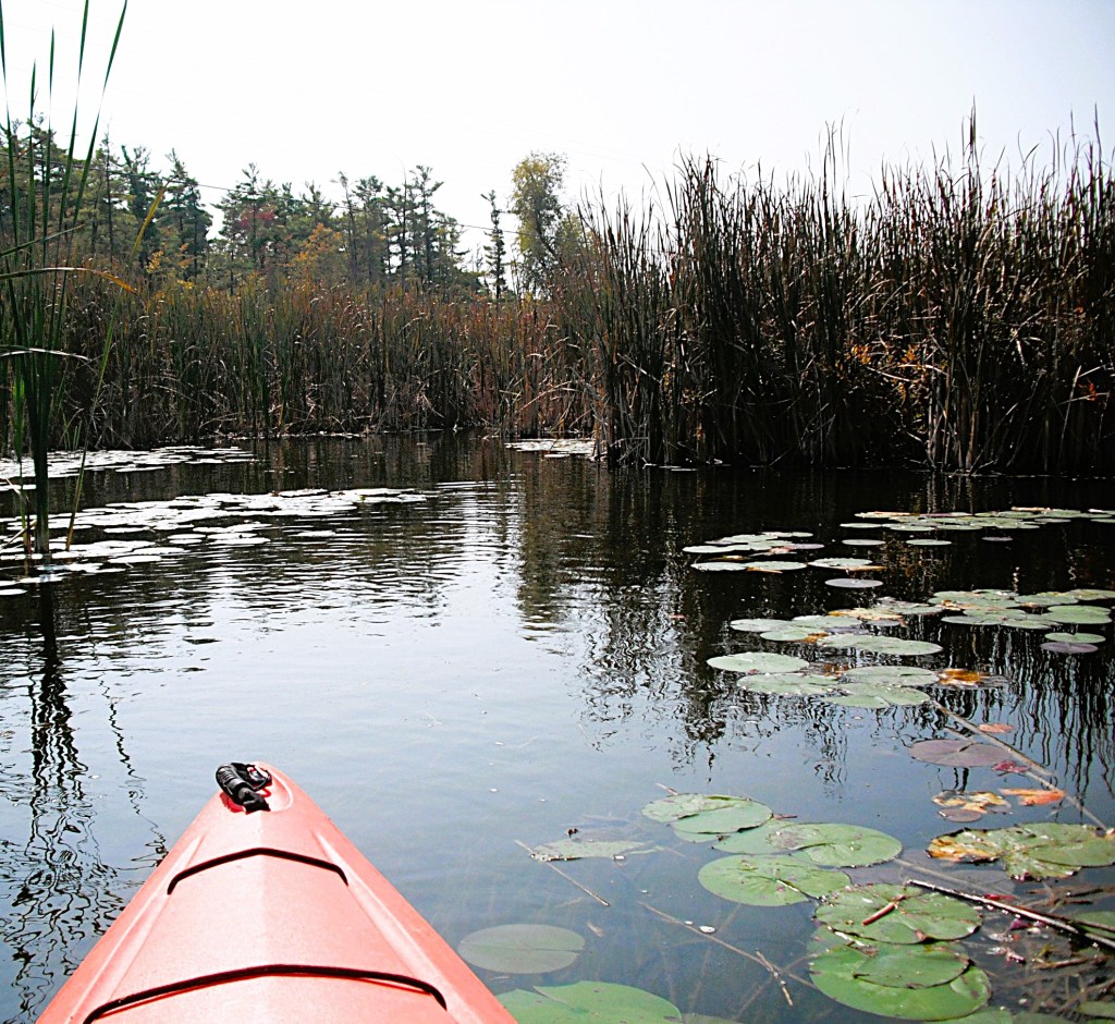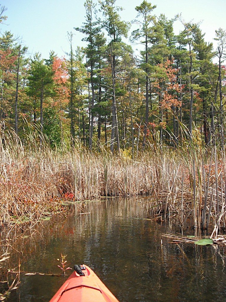 We paddled the recreation area shoreline south to the outlet, Payne Creek. The outlet is hidden in a small area of cattail marsh. The short waterway through the cattails will take you to the portage over highway M179. The water is deep next to the culverts, so be cautious.