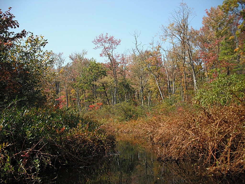 The first part of Payne Creek flows south through a cattail marsh bordered by woods. The east side of the creek is Yankee Springs State Recreation Area and the west side is undeveloped private property.