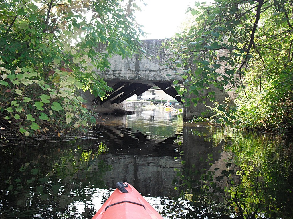 After passing under a dilapidated bridge, the scenic creek transitions to a channel lined with homes and empties into the north end of West Gun Lake.