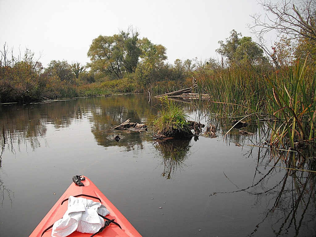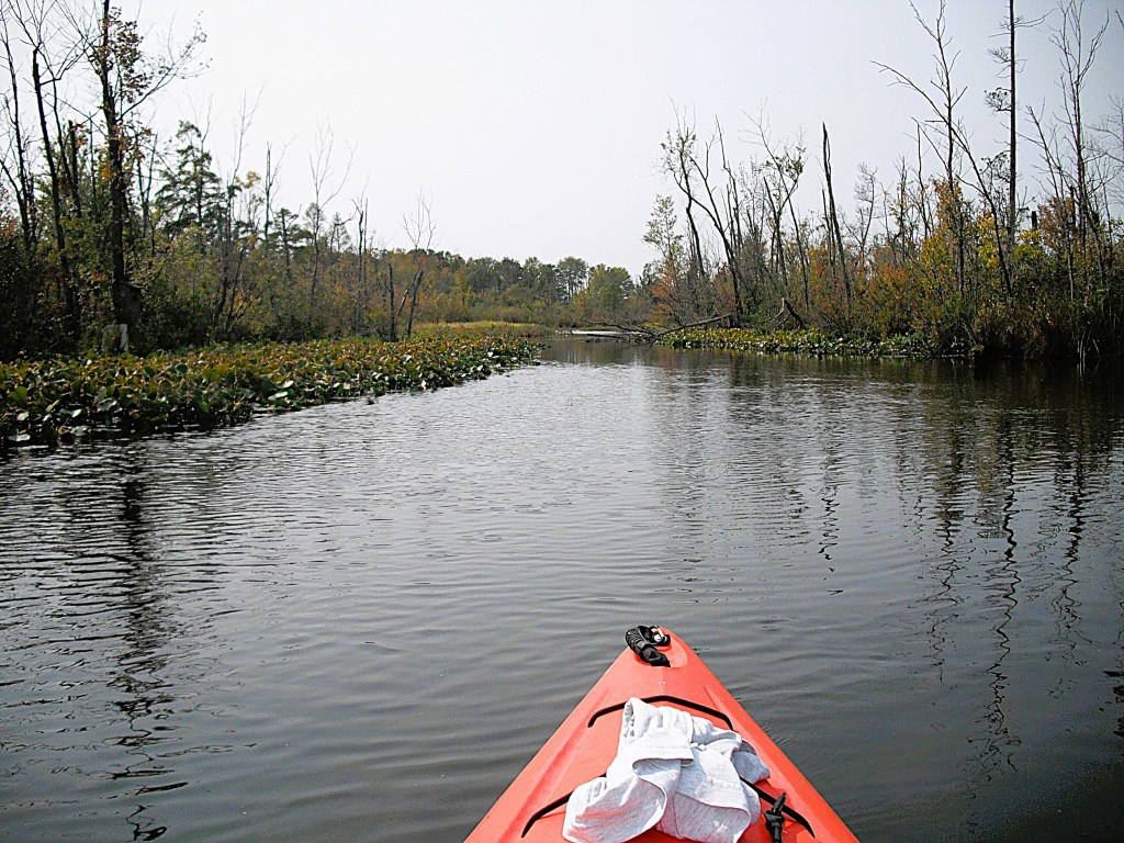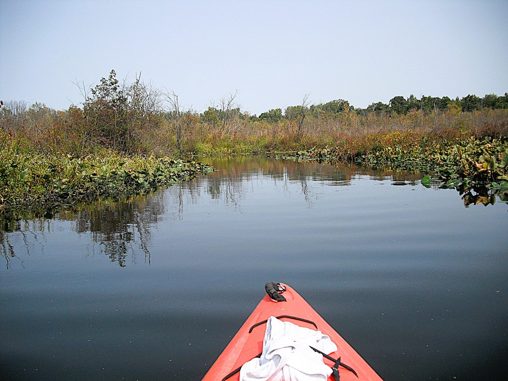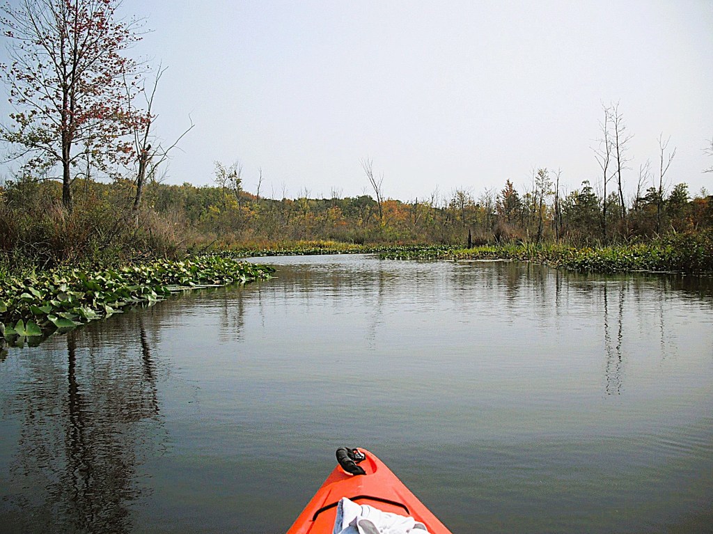 The river is shallow, the bottom is mud, and the current is very slow. It’s a pretty easy paddle. The stream is lined with lily pads and water willow.