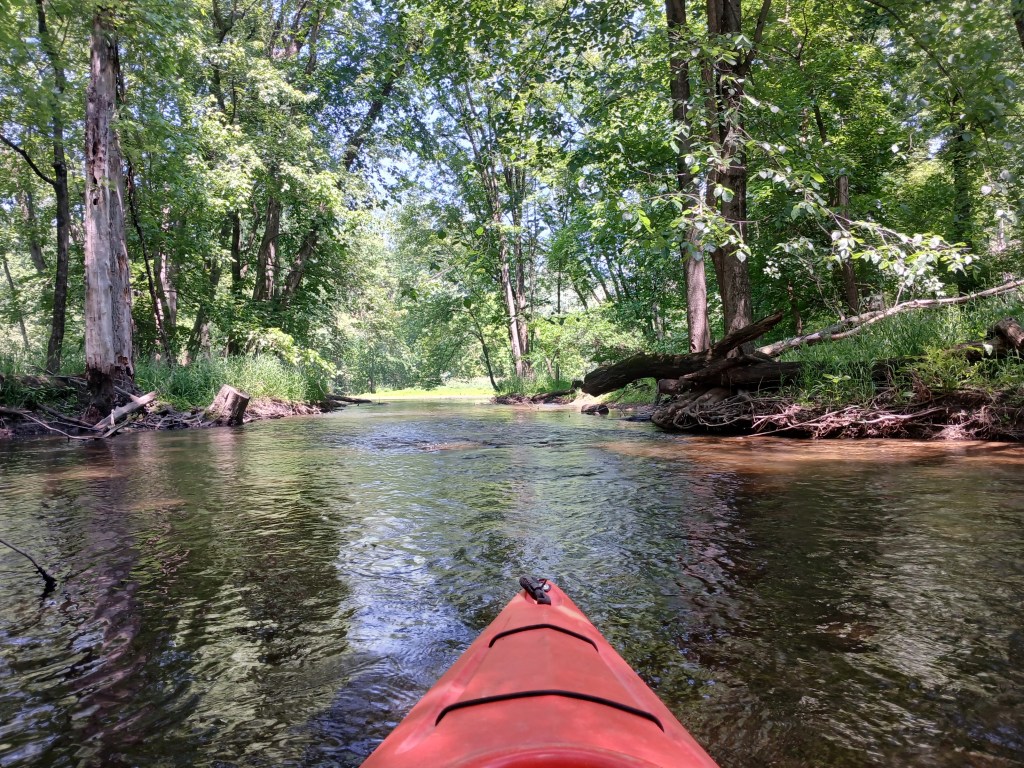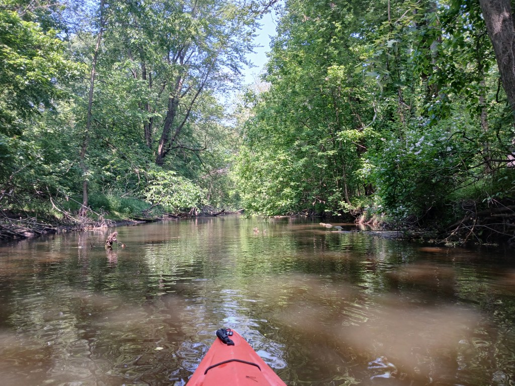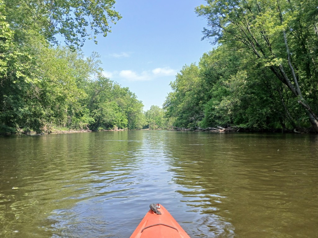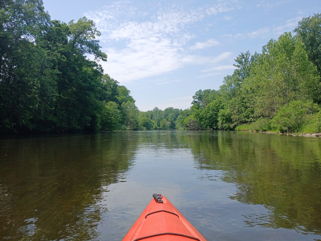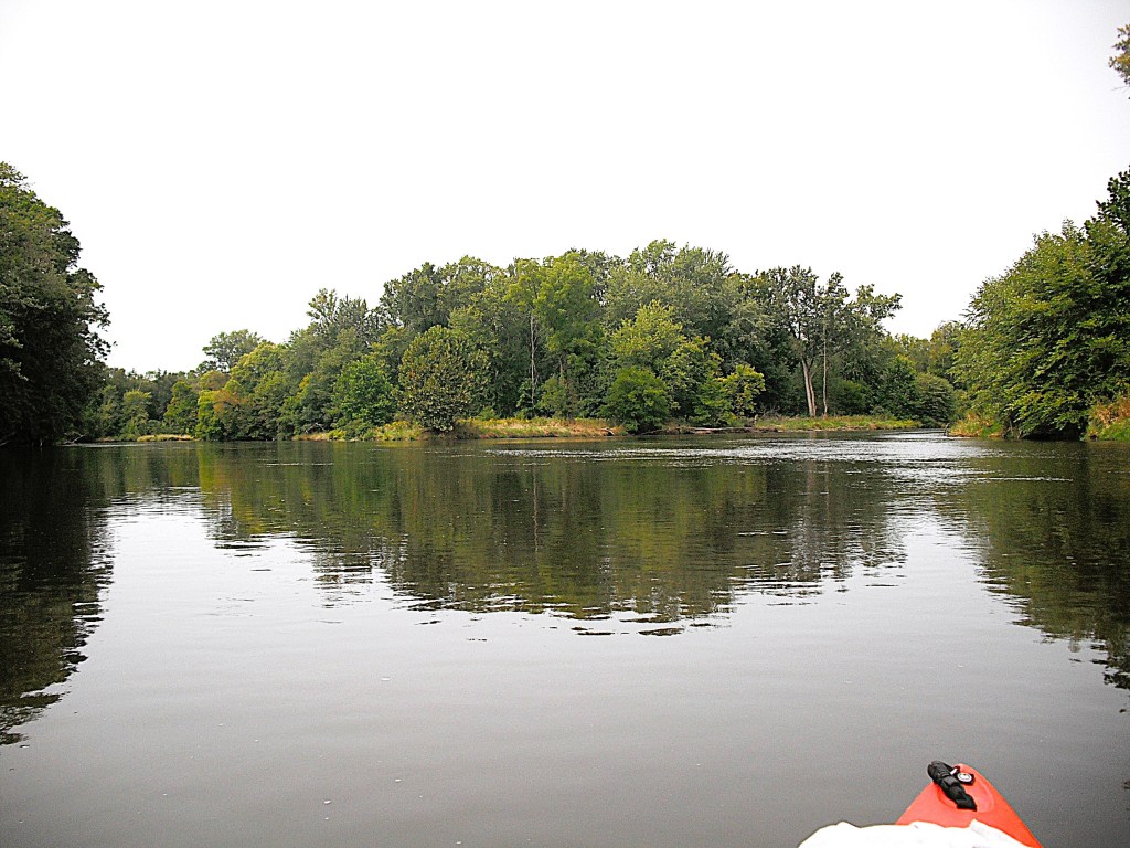 We kayaked the river in mid-September and the river was high and dirty. The current in this section varies between slow and moderate, but there are a few stretches of fast water. It is suitable for kayakers of all skill levels. Most of the shoreline is heavily wooded.