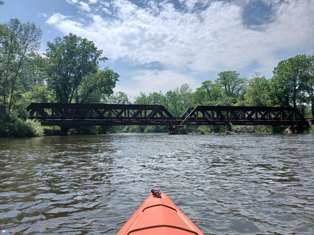 Farther downstream, a railroad bridge spans the river. The pony truss bridge was built in 1900 and is still in use.