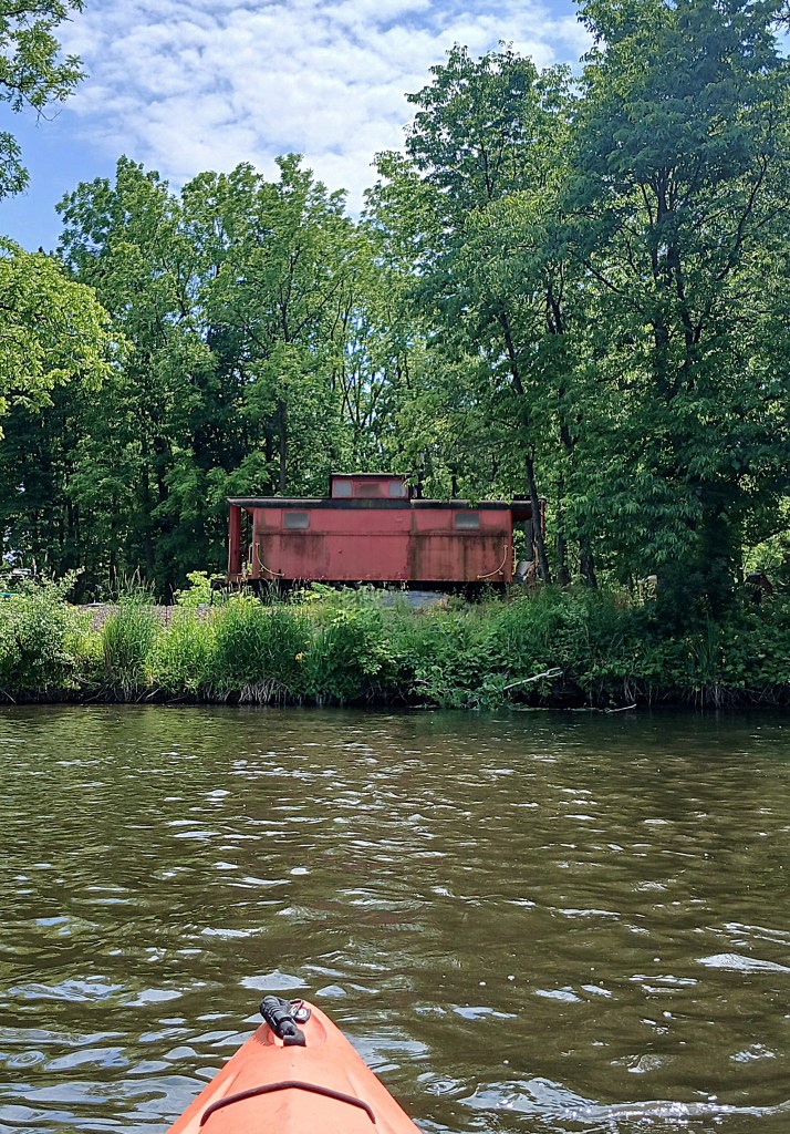 At the end of a straight stretch of the river, a railroad caboose is marooned on the left riverbank.