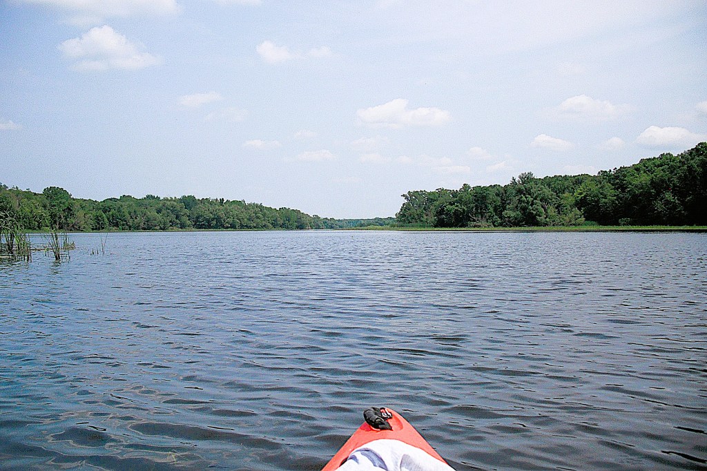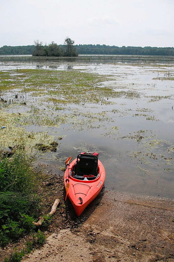 The trip ends at either of two boat landings. The River Oaks County Park lake access is on the north shore at the east end of the main basin. The boat ramp is hidden from view by a small island. This is the north island that was mentioned earlier.
