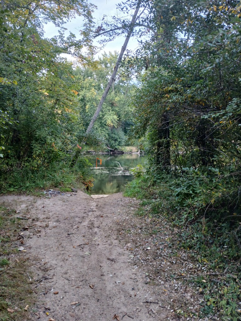 Continuing downstream, the other river access is on the left. The landing features a concrete boat ramp and a vault toilet.