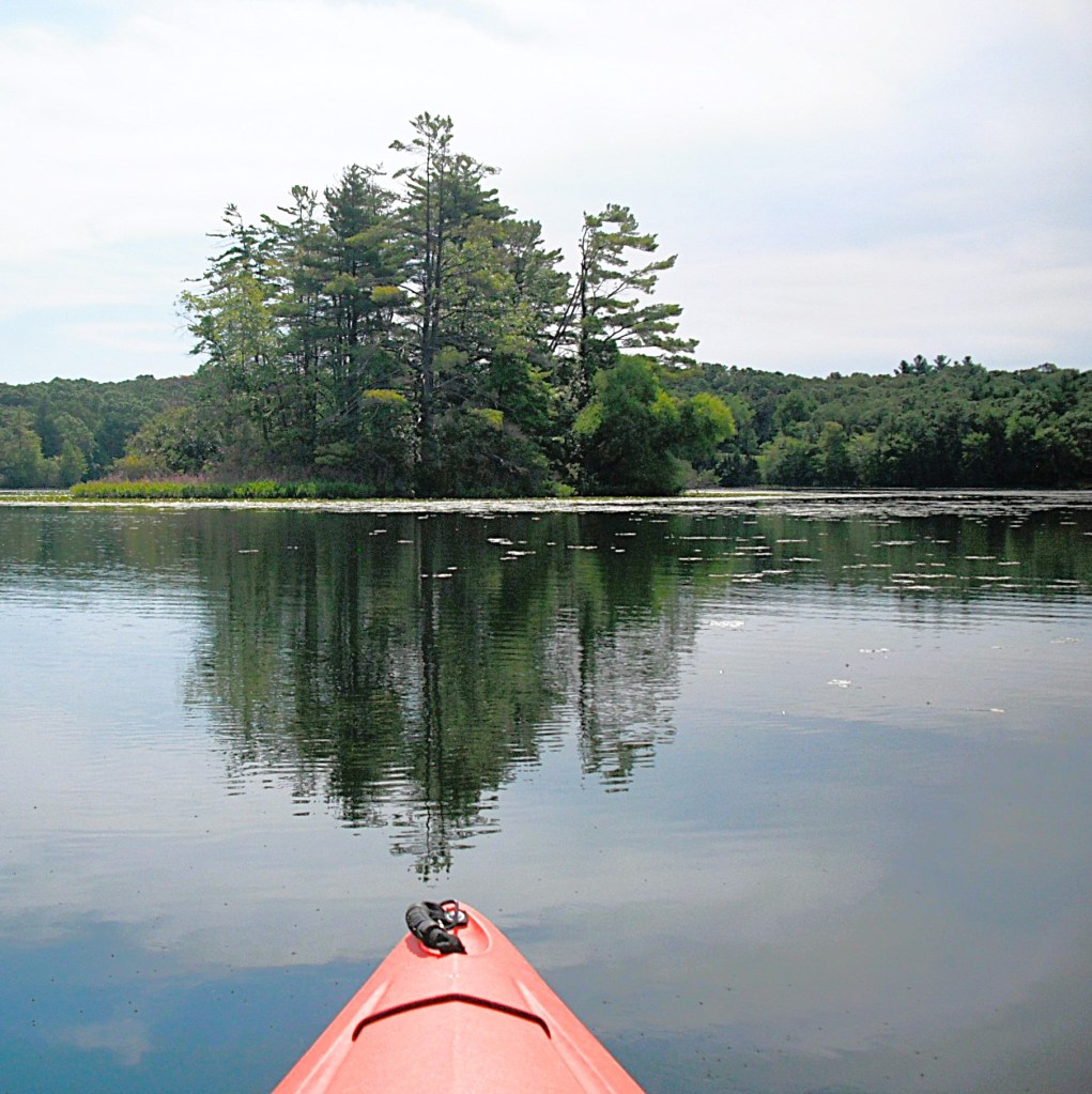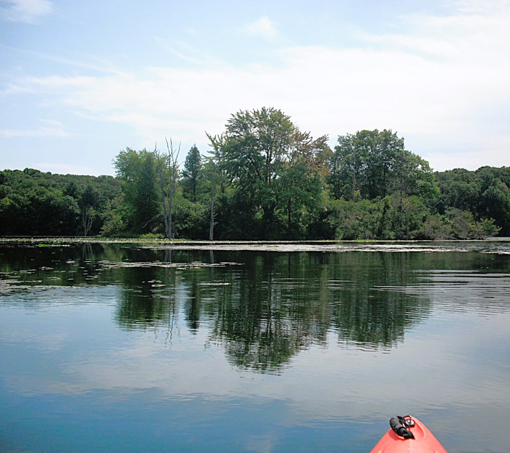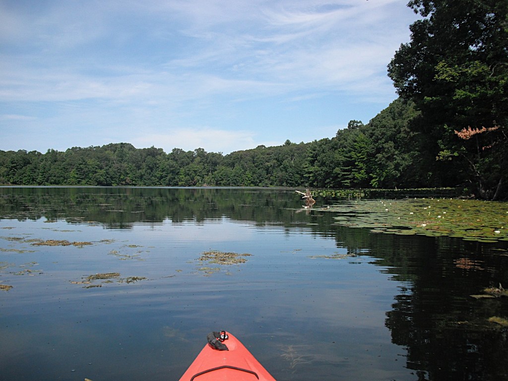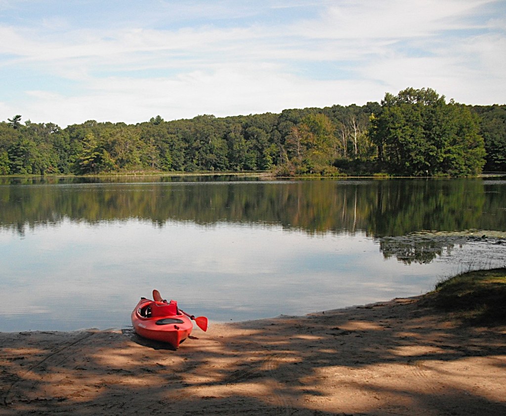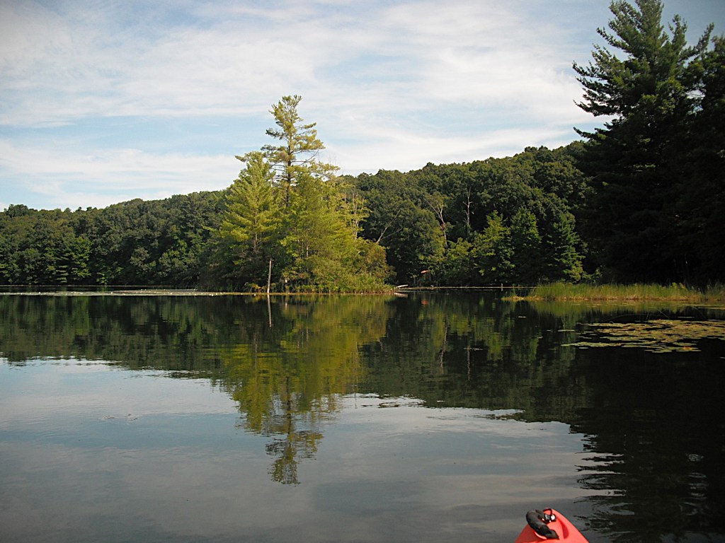 Besides Gun Lake, Hall Lake is one of the most visited lakes in the Yankee Springs area. I kayaked the lake on a weekday morning in August and I was surprised to have the whole lake all to myself. Hall Lake is located on the north side of Gun Lake Road, just east of Gun Lake. When you first view the lake from the road, it will draw you to its shore and compel you to kayak it. The small lake is surrounded by forested hills. The primitive landing is on the south side of the lake, just east of the dam.