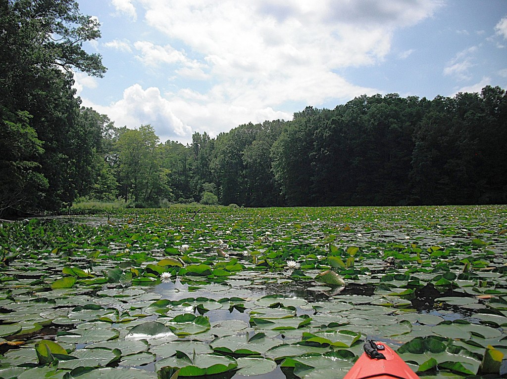 On the southeast corner of the east basin, there is a large, lily pad covered cove with a stream running into it.