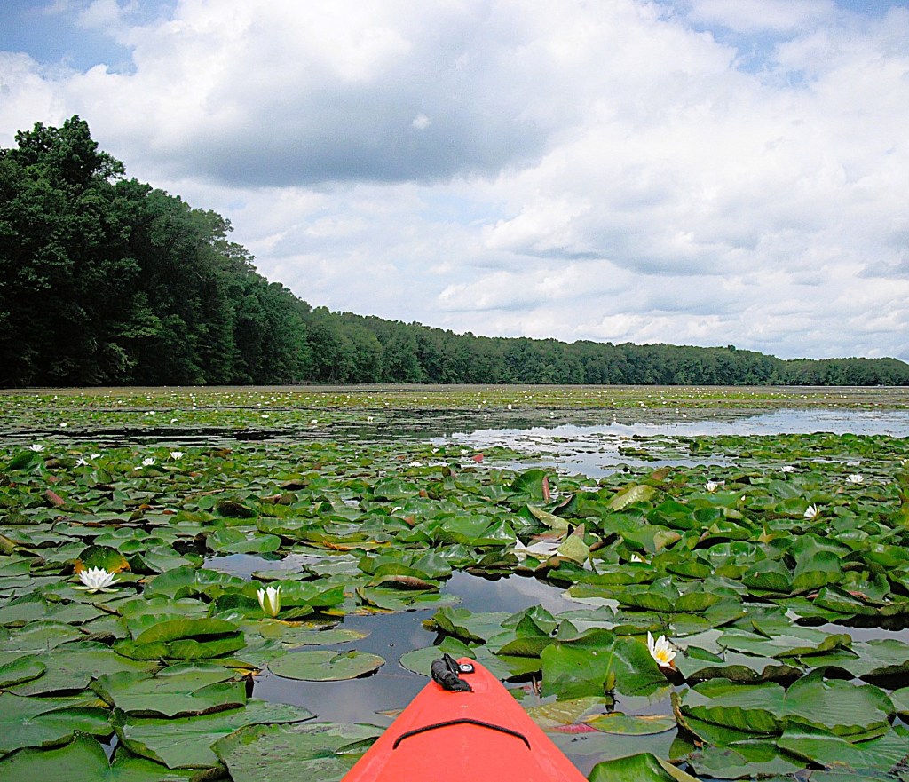 On this part of the lake, shoreline shade prevents vegetation from growing, leaving a water trail for kayakers to follow.