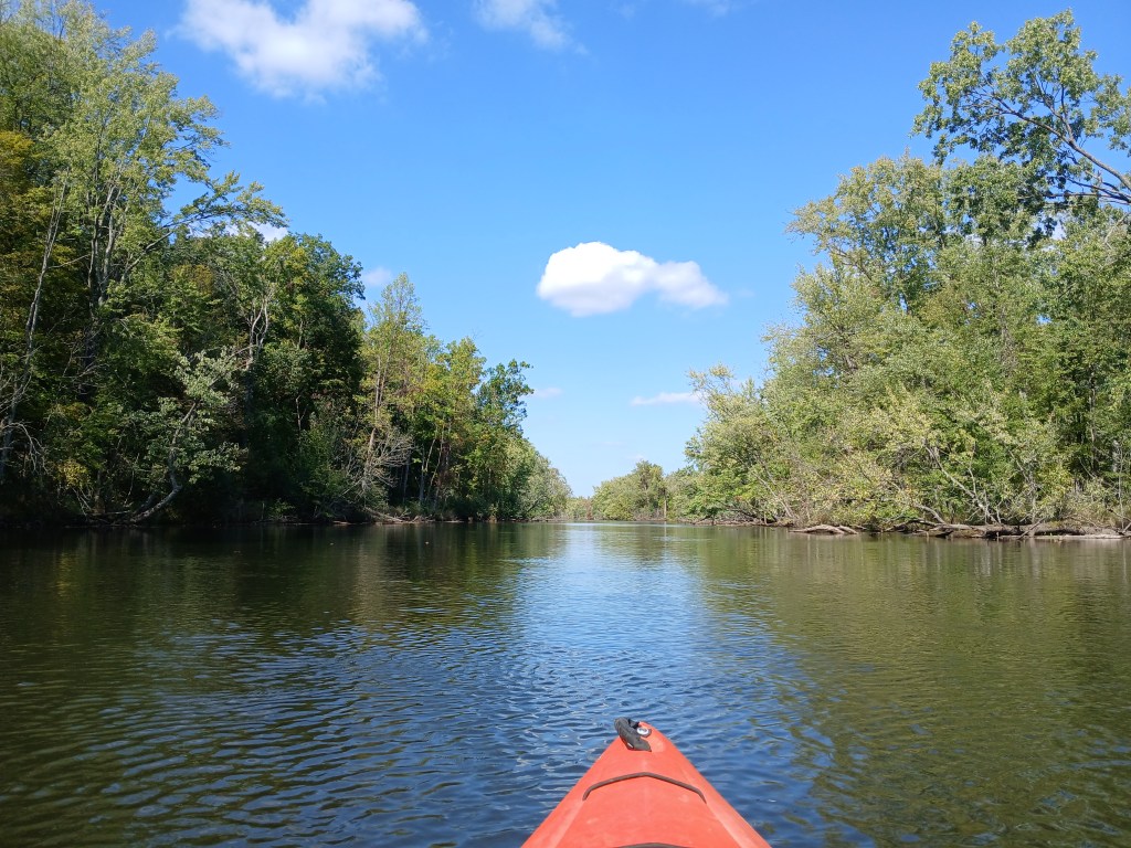 The river flows through the wooded countryside with long straightaways in between gentle curves.