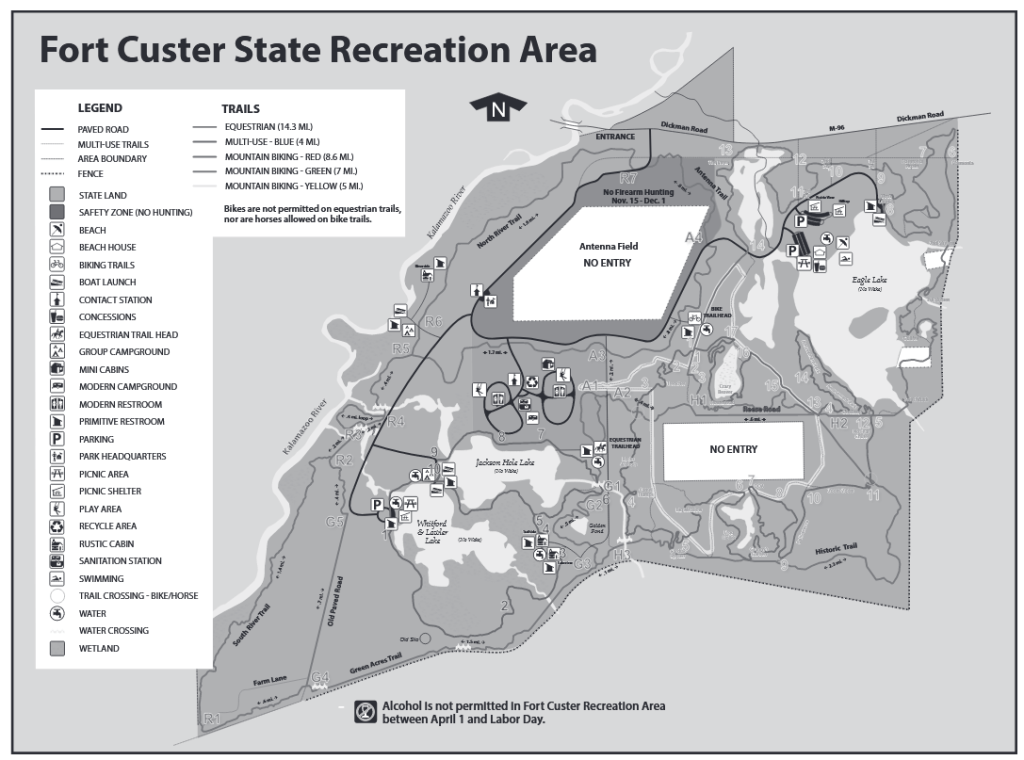 The entrance to Fort Custer State Recreation Area is on the north side of M96, east of the village of Augusta. The park is known for hiking, mountain biking, and horseback riding. The campground is modern, with restrooms and electricity. The Kalamazoo River flows through the park. The boat landing on the river is a good place to begin a trip to Galesburg or end a trip from Battle Creek. The recreation area is also popular for its four lakes. The lakes drain into the Kalamazoo River. Eagle Lake has a excellent boat ramp, picnic shelters, and a swimming beach. The other three lakes share a common access area. Whitford and Lawler Lakes are on the south side of the access. Jackson Hole Lake is on the north side. Park signs will direct boaters to each lake.