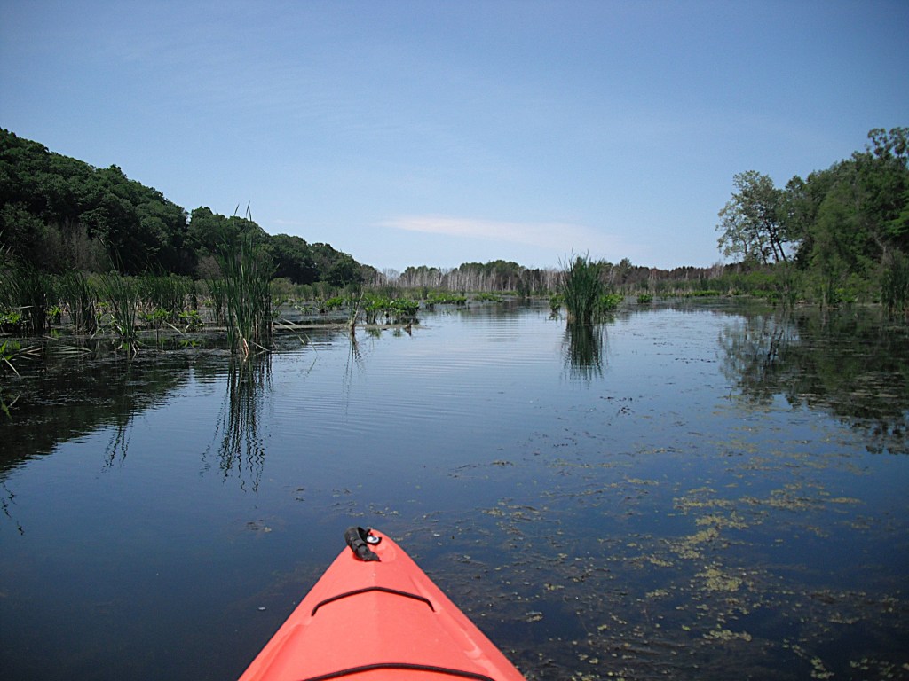 Fast forward to summer! Just before the river makes a slow curve to the west toward the river mouth, there is a swampy area on the west side of the river. This is where the channel to Oxbow Lake begins.