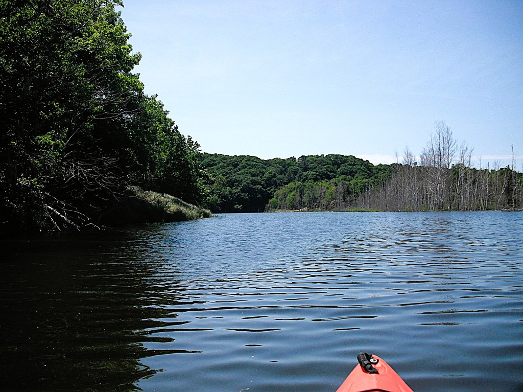 The channel is easy to spot and heads west through the swamp to Oxbow Lake. The lake was formed when a new river channel was constructed in 1906. The ends of the old river channel drifted shut with silt and sand and the lake was created. The only development on the lake is the small Oxbow School Of Art. Much of the land surrounding the lake is parkland and nature preserve, so it has a remote feel. On the east and south sides of the lake, steep wooded dunes come right down to the water’s edge. Some of the wooded dunes are over 200 feet tall.