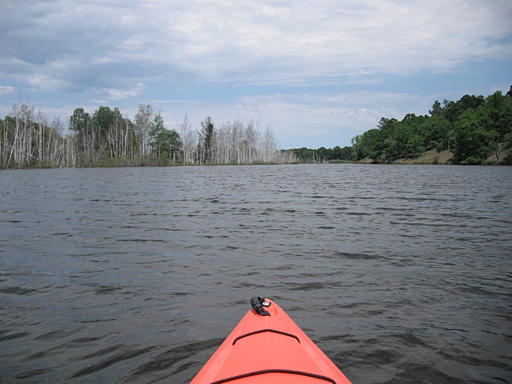 Parts of the lake are lined with dead birch trees, victims of high water.