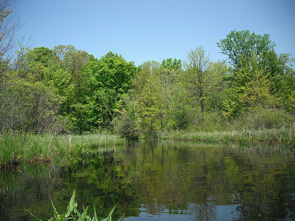 The scenery transitions to a mostly wooded area interspersed with wetland.