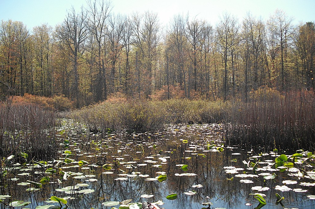 There is a small marshy area on the west side of the lake.