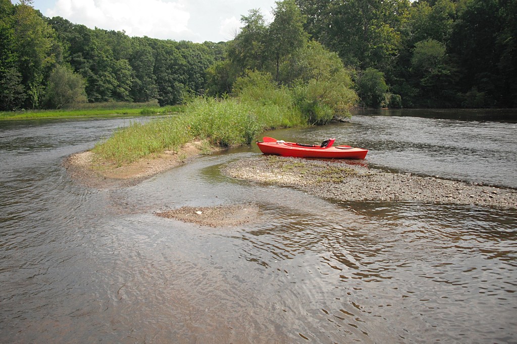 A boat landing is located on the south side of the river, at the tail end of the rapids, upstream from an island. The boat ramp is not visible from the rapids. Plan ahead and position your kayak accordingly if you plan on using this landing. The vehicle entrance to this access is on River Road. Update: The river is temporarily closed between this landing and Trowbridge Dam, so end your trip here. The river will reopen when dam removal and remediation is finished.