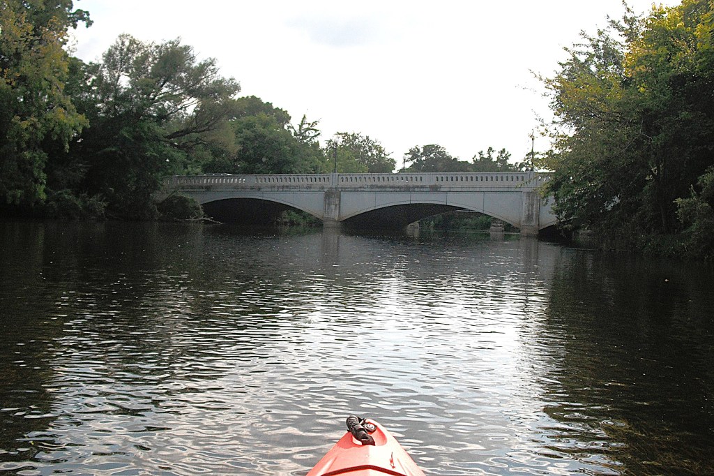 The creek passes under a low clearance bridge at 23rd Street. The banks on the side of the road are steep. The streamside is thick cattails and brush. Portaging over the road is not an option. I slouched way down in my kayak and barely made it under the bridge. Another time, I had to get out of my kayak and wade it under the bridge. Water levels may vary.