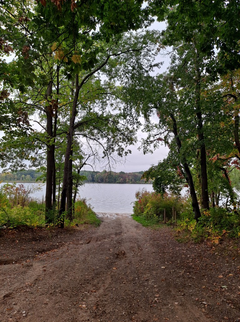 When approaching the dam, a small opening in the shoreline brush on the left marks the beginning of the portage trail.