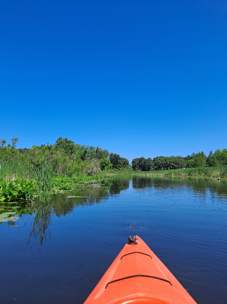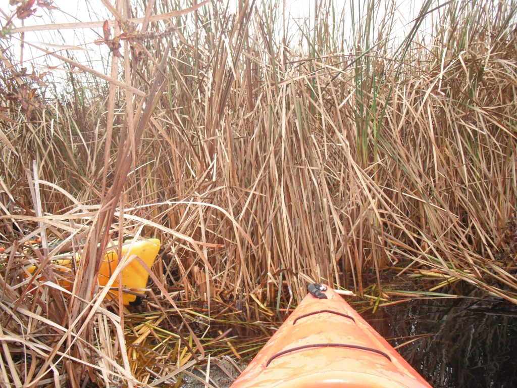 Kayaking Gourdneck Creek from Gourdneck Lake to Sunset Lake is mostly through cattail marshes. Sometimes, clumps of cattails break off from the cattail bed and float downstream, collecting in curves and narrow spots, blocking the creek. On my most recent trip, we fought our way through a blockage and it took us a half hour to go forty feet. Turning around and going back never entered our minds because quitting is for sissies. Be prepared!