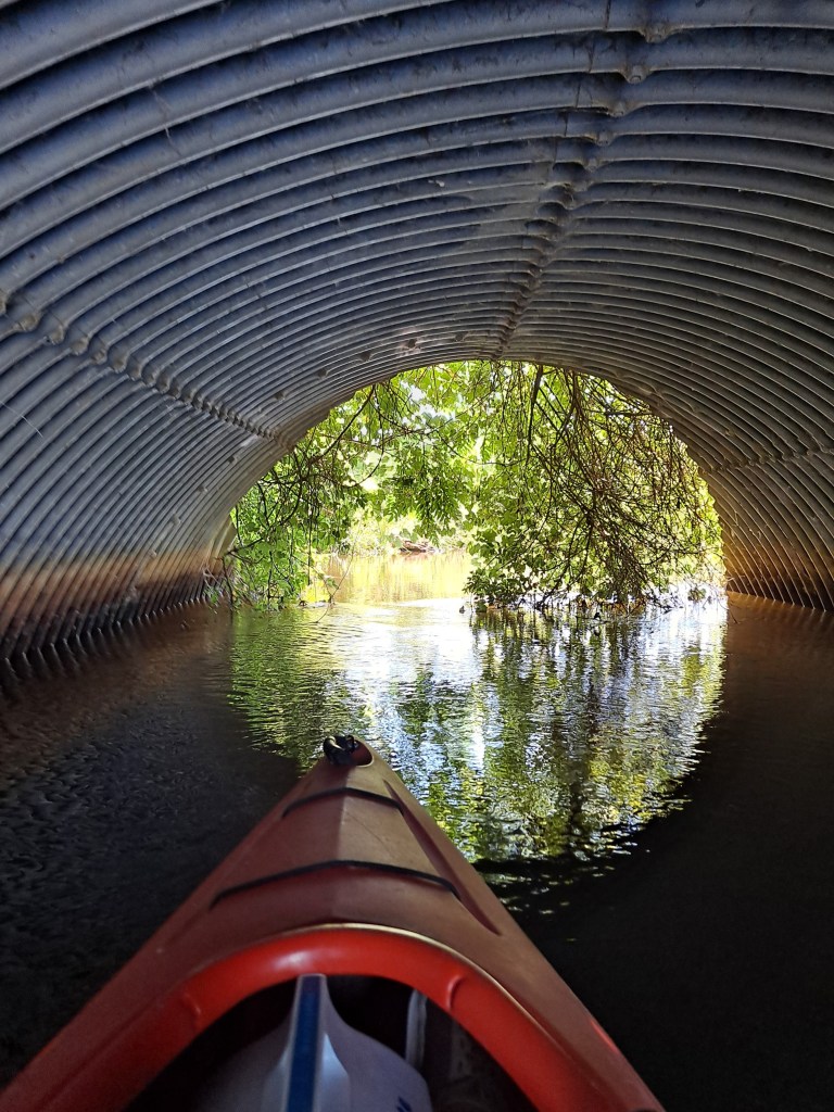 The creek passes through two large side-by-side culverts, but only one is navigable.