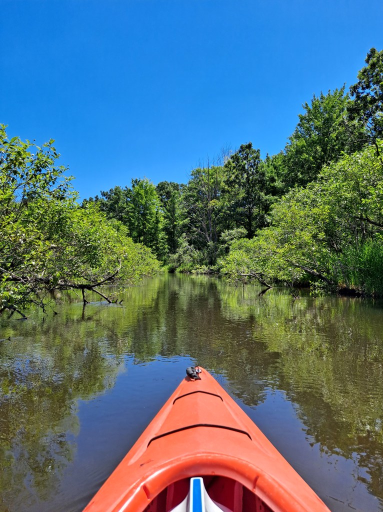 The creek gradually narrows as you go upstream and the current picks up speed. It’s not difficult to paddle against the current.