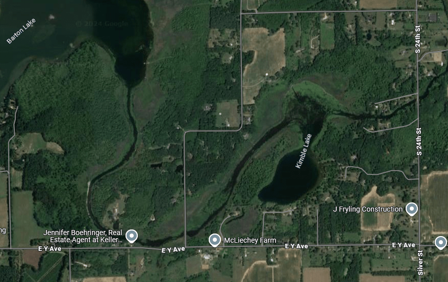 Below 22nd Street, the creek heads northeast and passes through the north end of Kimbal Lake before intersecting the Silver Street (South 24th Street) bridge, south of Vicksburg.