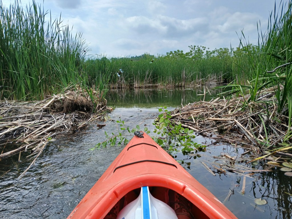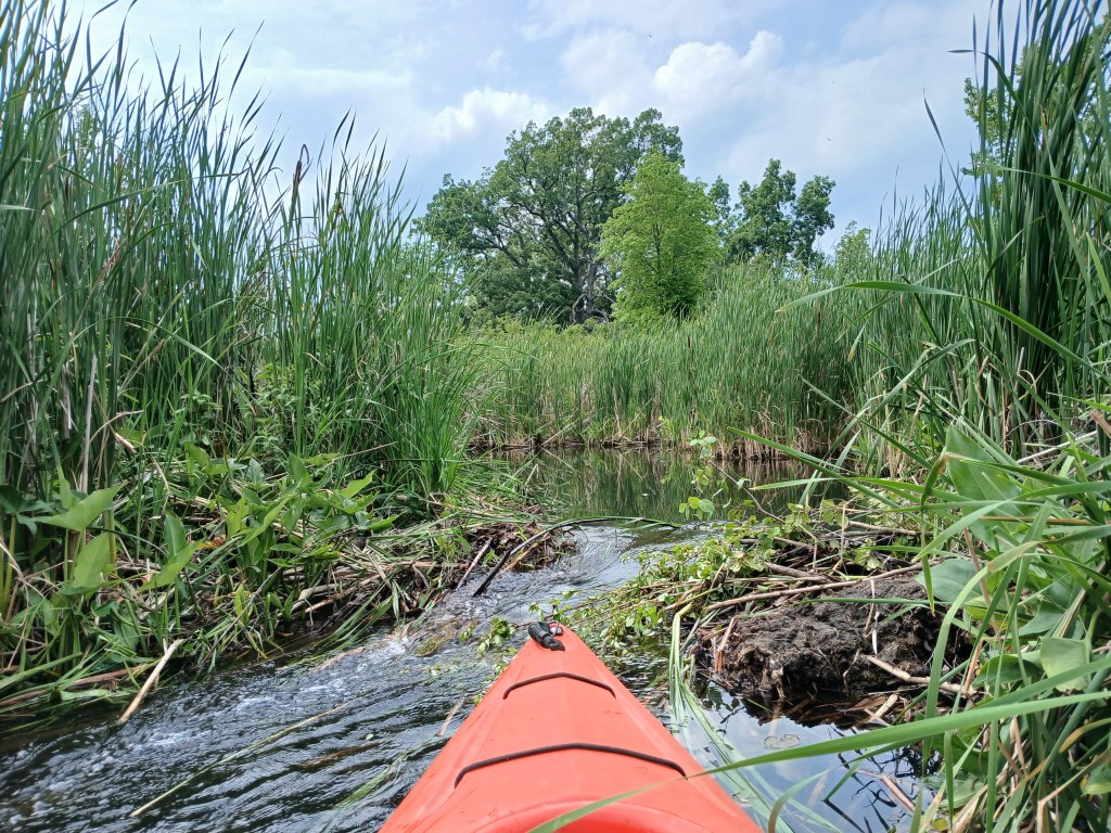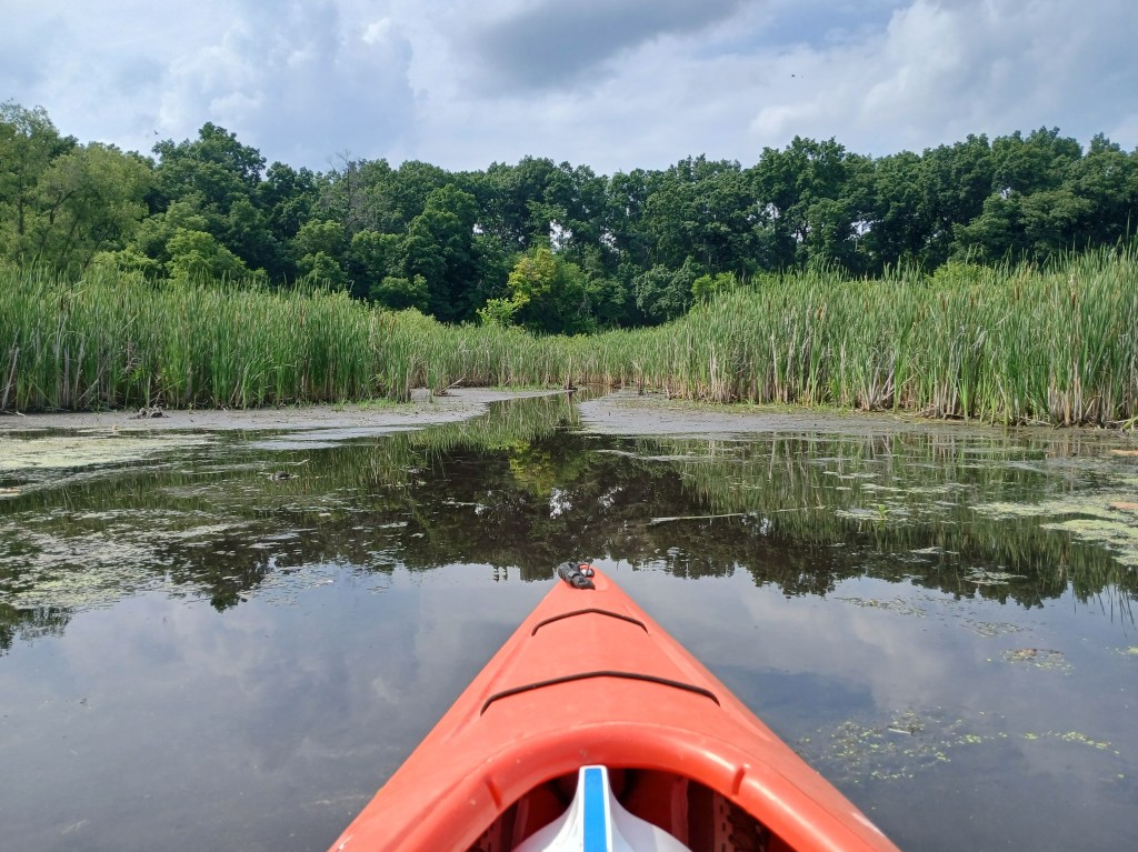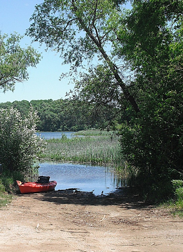 West Lake is my favorite lake of the Three lakes chain because of its wild, remote location. The unnamed creek that takes kayakers from Middle Lake to West Lake meanders through a cattail marsh lined by woods. There was a beaver dam on the creek that had to be portaged. At the time of this writing, in early June 2022, the dam had been removed. Sometimes beavers will rebuild structures. Portaging beaver dams can be a challenge.