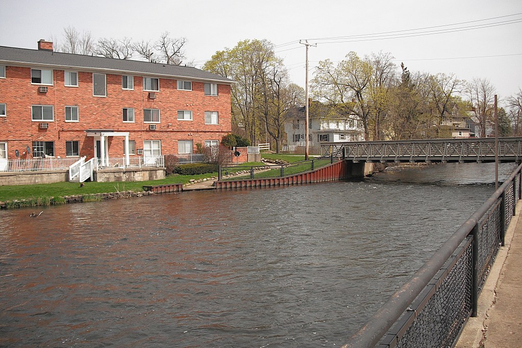 On a early spring scouting trip, I couldn’t find a really good Kalamazoo River boat landing in Albion. The best one looked like the Porter Street Landing. There is a public parking lot on the north side of Erie Street, east of Superior Street. Park on the north end of the lot by the Farmer’s Market, next to a flight of concrete steps. At the bottom of the steps, head east one hundred yards to a pedestrian bridge across the river. After crossing the bridge, there is a sidewalk that dead-ends at the edge of the river, in the backyard of the Riverview Apartments.