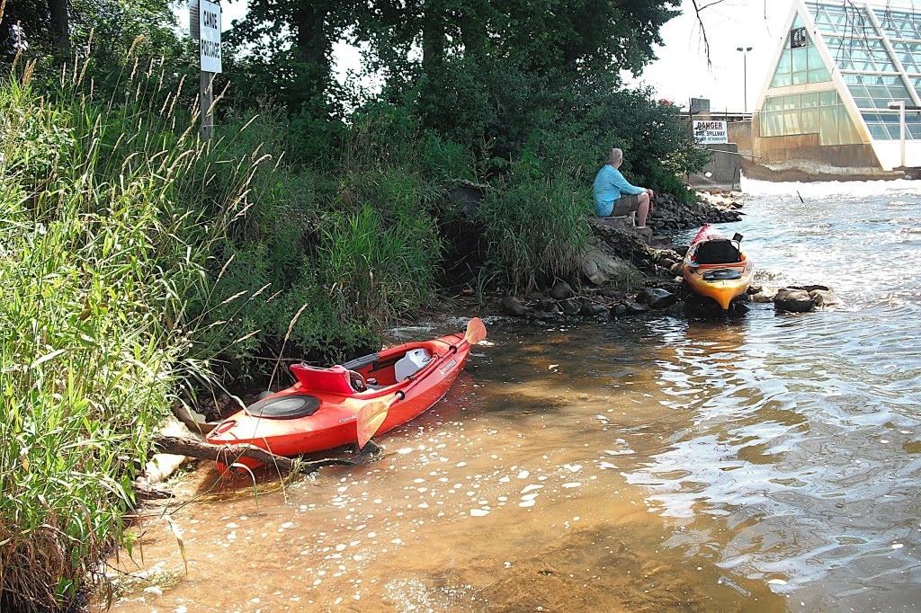 West of the wall, at the bottom of an embankment, there is a short trail through a small wooded area. At the end of the trail, concrete steps lead down to the river. At the bottom of the steps, rough water from the spillway can be expected. There is a better place to get in your kayak that is slightly downstream from the steps.
