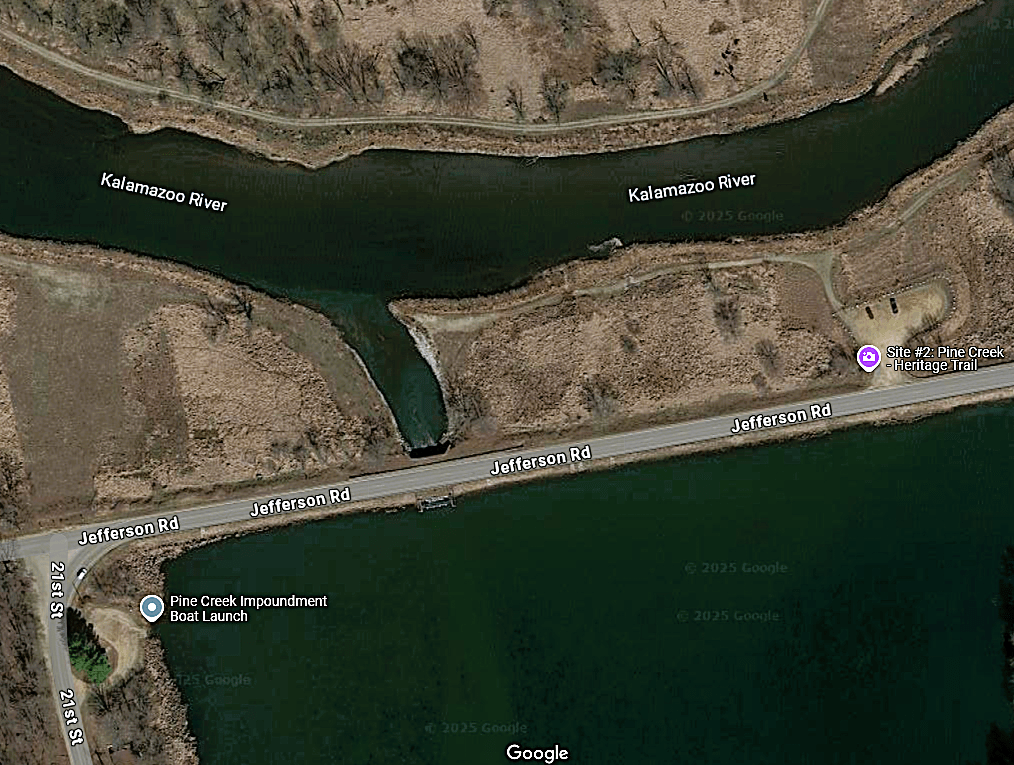 Jefferson Road is south of the Kalamazoo River and parallel to it. Pine Creek Impoundment is across the road from the river. Pine Creek flows out of the impoundment at a water level control structure next to the south side of Jefferson Road. The water flows over the control boards of the structure and through two large culverts under Jefferson Road. Then, the creek empties into the Kalamazoo River.