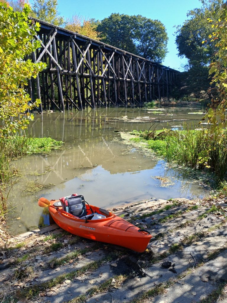 After paddling under the trestle, the waterway splits in two. To the right, northeast, the dam has created a scenic lake.