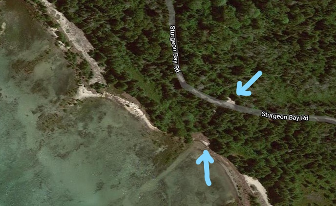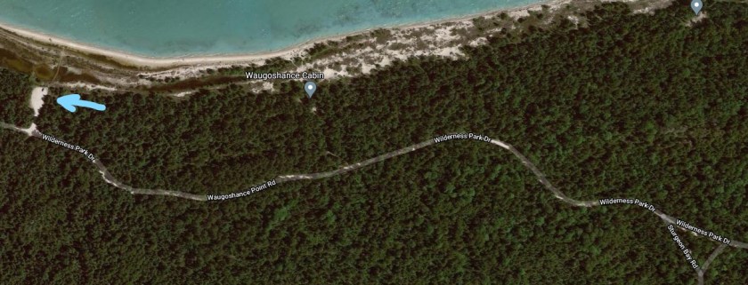 If you are paddling the north side of the point, continue west on Waugoshance Point Road, past Sturgeon Bay Road. There is a parking area on the north side of the road. It’s a short carry to the lake.