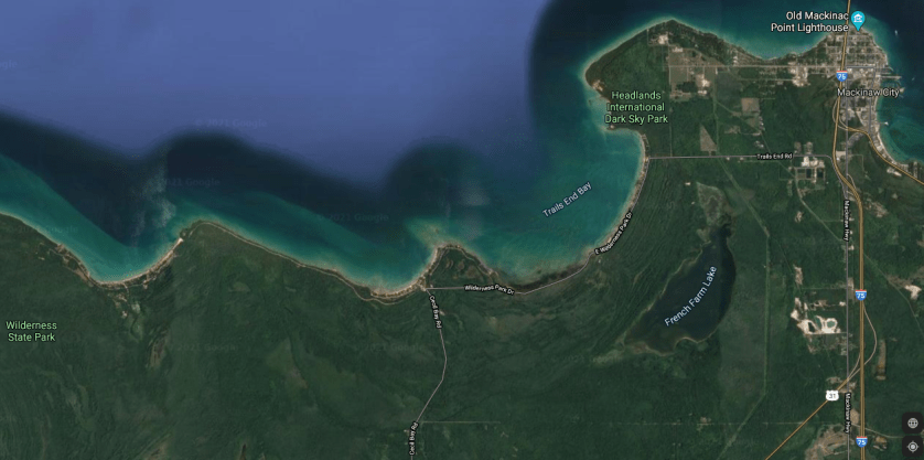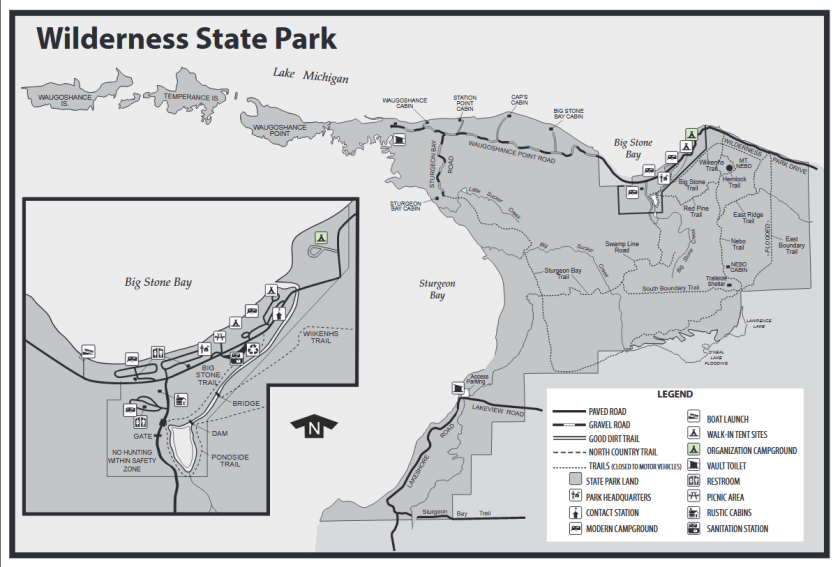 The easiest way to access Wilderness State Park is from Mackinaw City. Head west from Mackinaw City on either Central Avenue or Trails End Road. The two roads intersect Wilderness Park Drive, which will take you to the park. Wilderness Park Drive follows the shore of Lake Michigan, offering views of Trails End Bay, Cecil Bay, and Big Stone Bay. There is a park boat landing on Big Stone Bay. Once inside the park, continue west on Wilderness Park Road, also called Waugoshance Point Road.