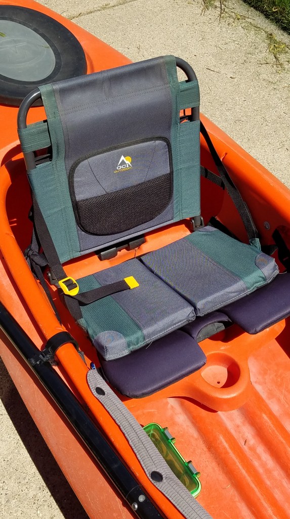 Seats in most kayaks have a short back. This lack of support can give a kayaker back pain. I remedied this situation by purchasing a seat intended for a canoe. It attaches to the kayak by straps and buckles. I find that my weight is enough to hold the seat in place so I don’t use the straps. The back of this seat is tall enough to give adequate back support and it folds flat for easy storage.